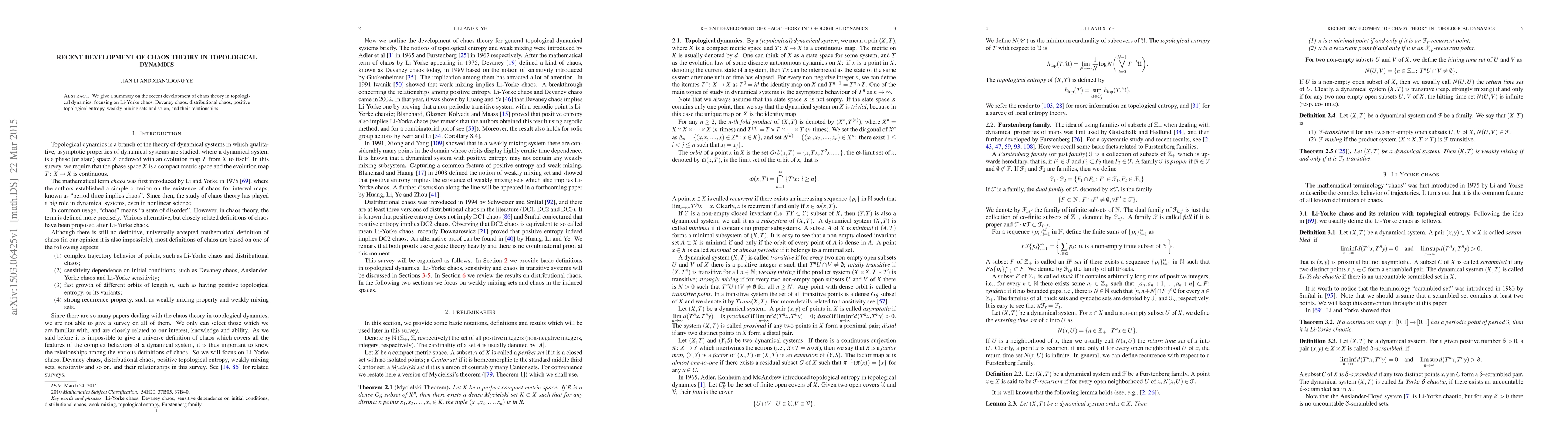 This paper reviews recent advancements in chaos theory within topological dynamics, emphasizing concepts like Li-Yorke chaos, Devaney chaos, distributional chaos, positive topological entropy, and weakly mixing sets, along with their interconnections.