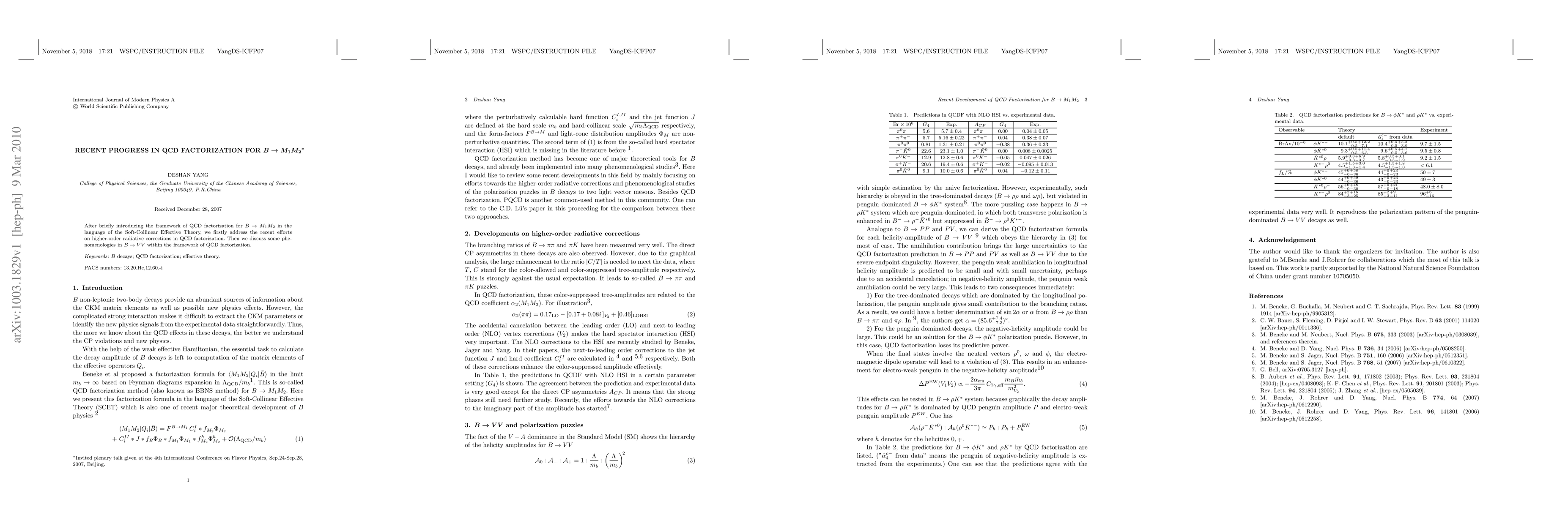 After briefly introducing the framework of QCD factorization for B-> M1 M2 in the language of the Soft-Collinear Effective Theory, we firstly address the recent efforts on higher-order radiative corrections in QCD factorization. Then we discuss some phenomenologies in B-> V V within the framework of QCD factorization.