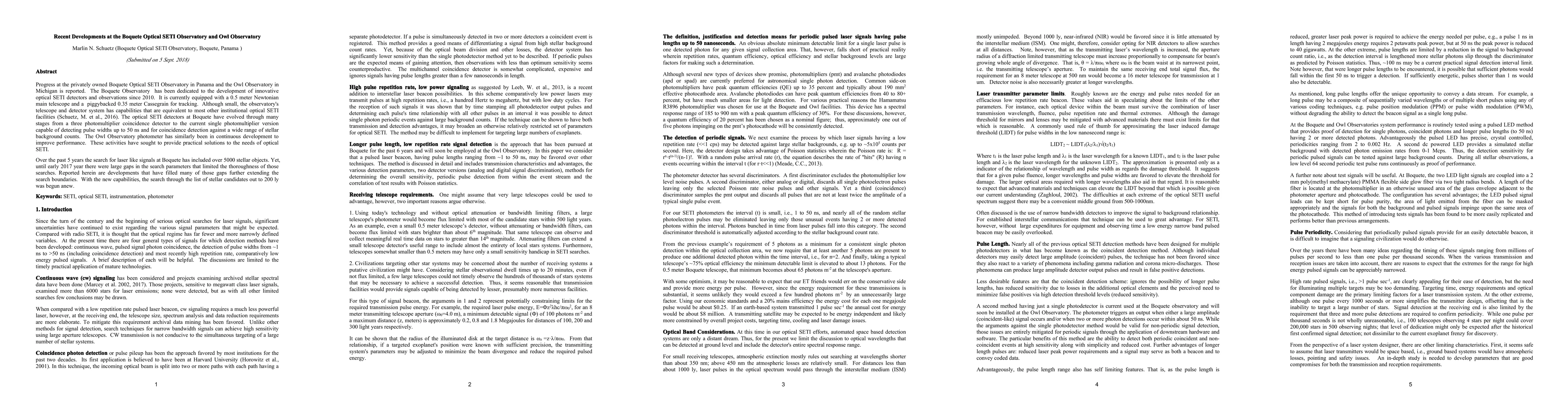 Progress at the privately owned Boquete Optical SETI Observatory in Panama and the Owl Observatory in Michigan is reported. The Boquete Observatory has been dedicated to the development of innovative optical SETI detectors and observations since 2010. It is currently equipped with a 0.5 meter Newtonian main telescope and a piggybacked 0.35 meter Cassegrain for tracking. Although small, the observatory's telescope and detector system has capabilities that are equivalent to most other institutional optical SETI facilities (Schuetz, M. et al., 2016). The optical SETI detectors at Boquete have evolved through many stages from a three photomultiplier coincidence detector to the current single photomultiplier version capable of detecting pulse widths up to 50 ns and for coincidence detection against a wide range of stellar background counts. The Owl Observatory photometer has similarly been in continuous development to improve performance. These activities have sought to provide practical solutions to the needs of optical SETI. Over the past 5 years the search for laser like signals at Boquete has included over 5000 stellar objects. Yet, until early 2017 year there were large gaps in the search parameters that limited the thoroughness of those searches.Reported herein are developments that have filled many of those gaps further extending the search boundaries. With the new capabilities, the search through the list of stellar candidates out to 200 ly was begun anew.