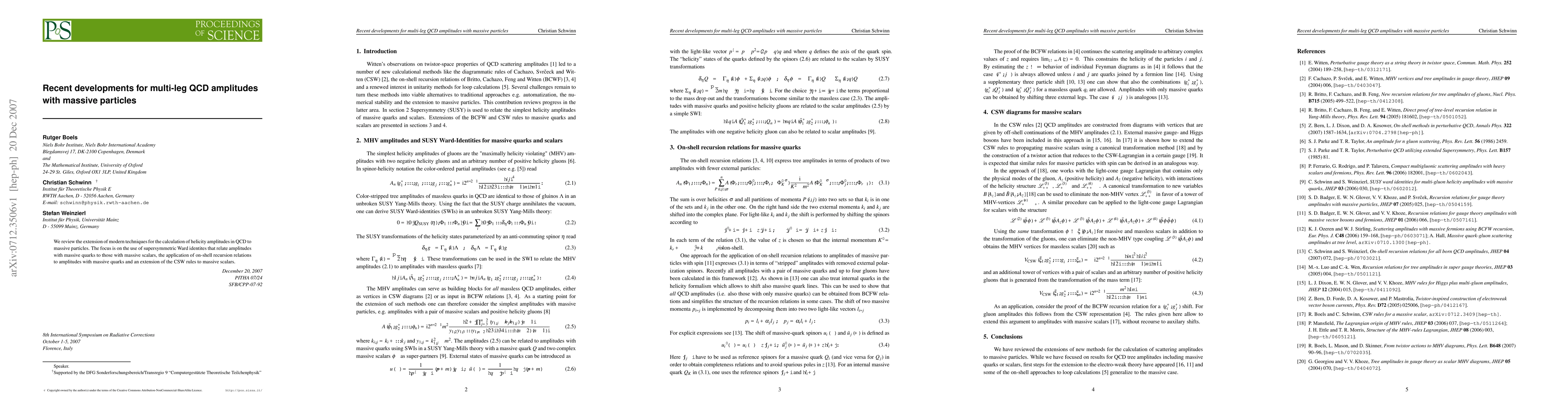 This paper reviews advancements in calculating multi-leg QCD amplitudes involving massive particles, emphasizing the use of supersymmetric Ward identities, on-shell recursion relations, and the extension of CSW rules for massive scalars. The focus is on novel techniques linking massive quark and scalar amplitudes.