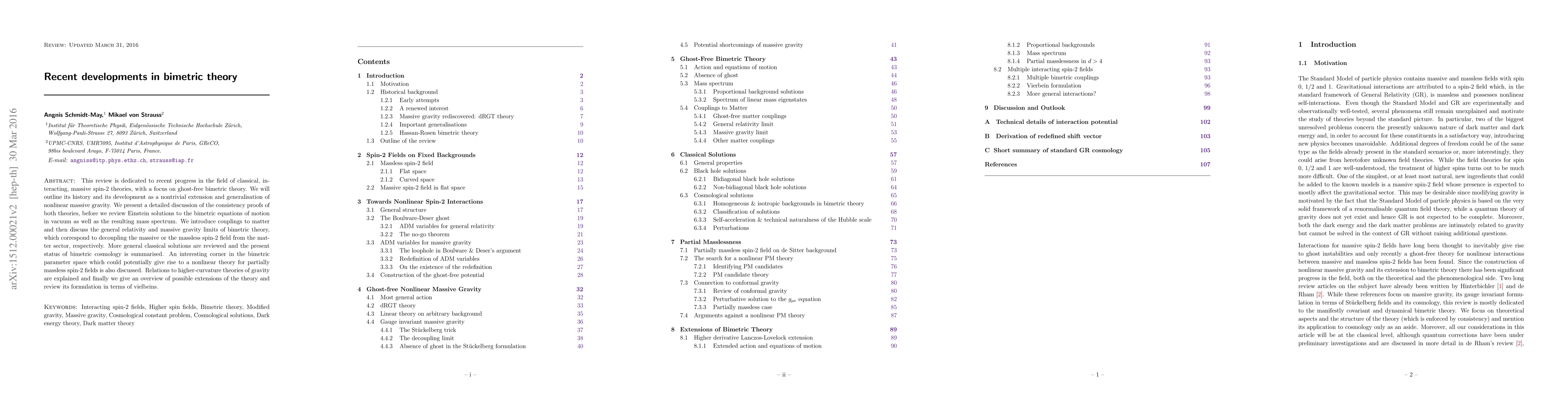 The paper offers a detailed analysis of bimetric theory, including its consistency, classical solutions, and matter couplings, providing a thorough review of recent developments in this area of research.