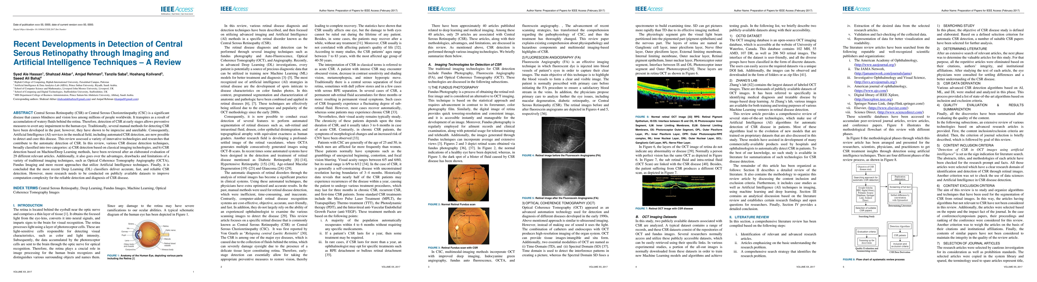 This review examines recent advancements in detecting Central Serous Retinopathy (CSR) using imaging and Artificial Intelligence techniques, highlighting the shift from traditional imprecise methods to more accurate Deep Learning classifiers. It evaluates both classical imaging and AI-based detection methods, concluding that while Deep Learning shows promise, further research is needed to enhance dataset availability and computational efficiency.