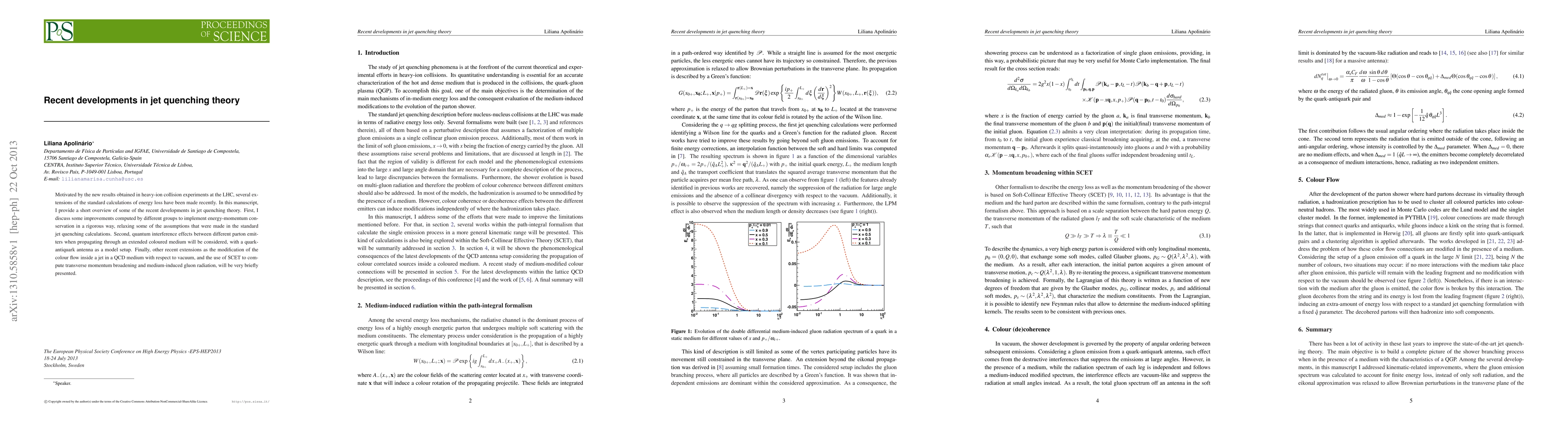 Motivated by the new results obtained in heavy-ion collision experiments at the LHC, several extensions of the standard calculations of energy loss have been made recently. In this manuscript, I provide a short overview of some of the recent developments in jet quenching theory. First, I discuss some improvements computed by different groups to implement energy-momentum conservation in a rigorous way, relaxing some of the assumptions that were made in the standard jet quenching calculations. Second, quantum interference effects between different parton emitters when propagating through an extended coloured medium will be considered, with a quark- antiquark antenna as a model setup. Finally, other recent extensions as the modification of the colour flow inside a jet in a QCD medium with respect to vacuum, and the use of SCET to compute transverse momentum broadening and medium-induced gluon radiation, will be very briefly presented.