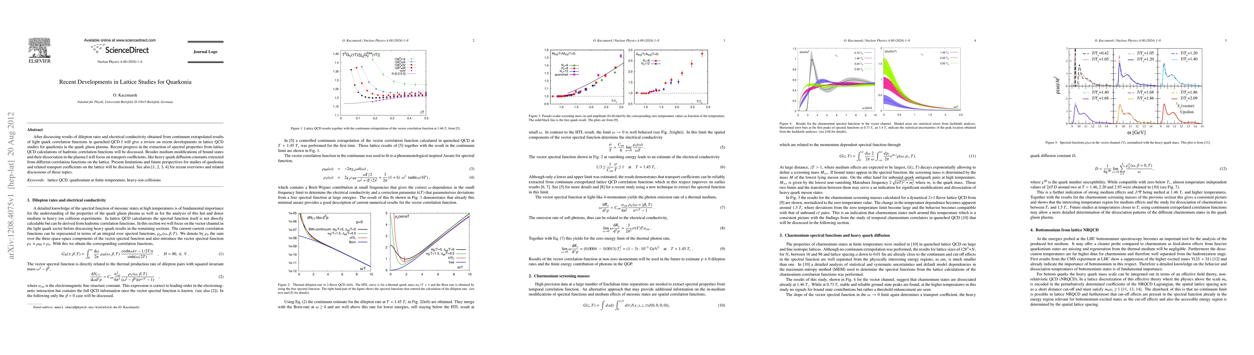 After discussing results of dilepton rates and electrical conductivity obtained from continuum extrapolated results of light quark correlation functions in quenched QCD I will give a review on recent developments in lattice QCD studies for quarkonia in the quark gluon plasma. Recent progress in the extraction of spectral properties from lattice QCD calculations of hadronic correlation functions will be discussed. Besides medium modifications of bound states and their dissociation in the plasma I will focus on transport coefficients, like heavy quark diffusion constants extracted from different correlation functions on the lattice. Present limitations and future perspectives for studies of quarkonia and related transport coefficients on the lattice will be discussed.