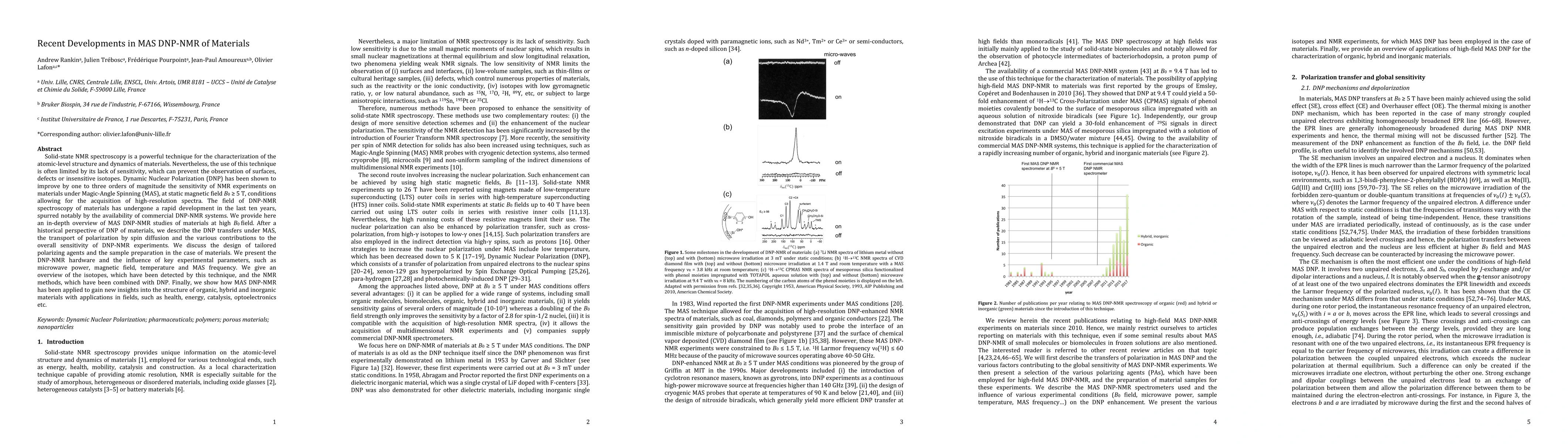 The paper provides an in-depth overview of MAS DNP-NMR studies of materials at high magnetic fields, detailing its development, methodology, and applications. It covers DNP transfers, polarizing agents, experimental parameters, detectable isotopes, and combined NMR methods. The technique has been successfully applied to understand the structure of various materials in fields like health, energy, and electronics.