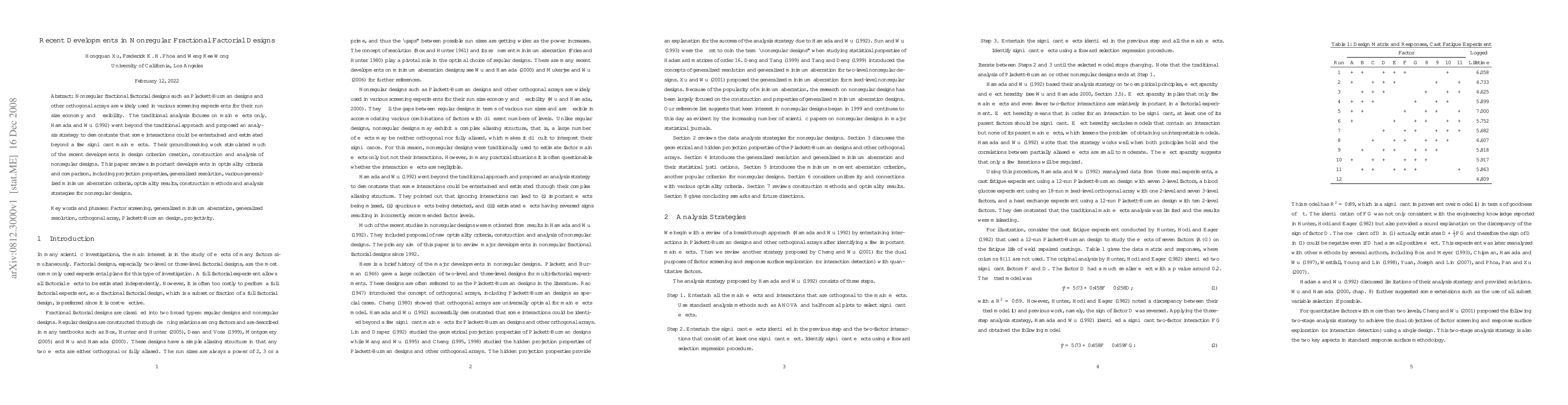 This paper reviews recent advancements in nonregular fractional factorial designs, focusing on the creation of new optimality criteria, construction methods, and analysis strategies that extend beyond the traditional main effects analysis to include interaction effects. It highlights developments in projection properties, generalized resolution, and generalized minimum aberration criteria.