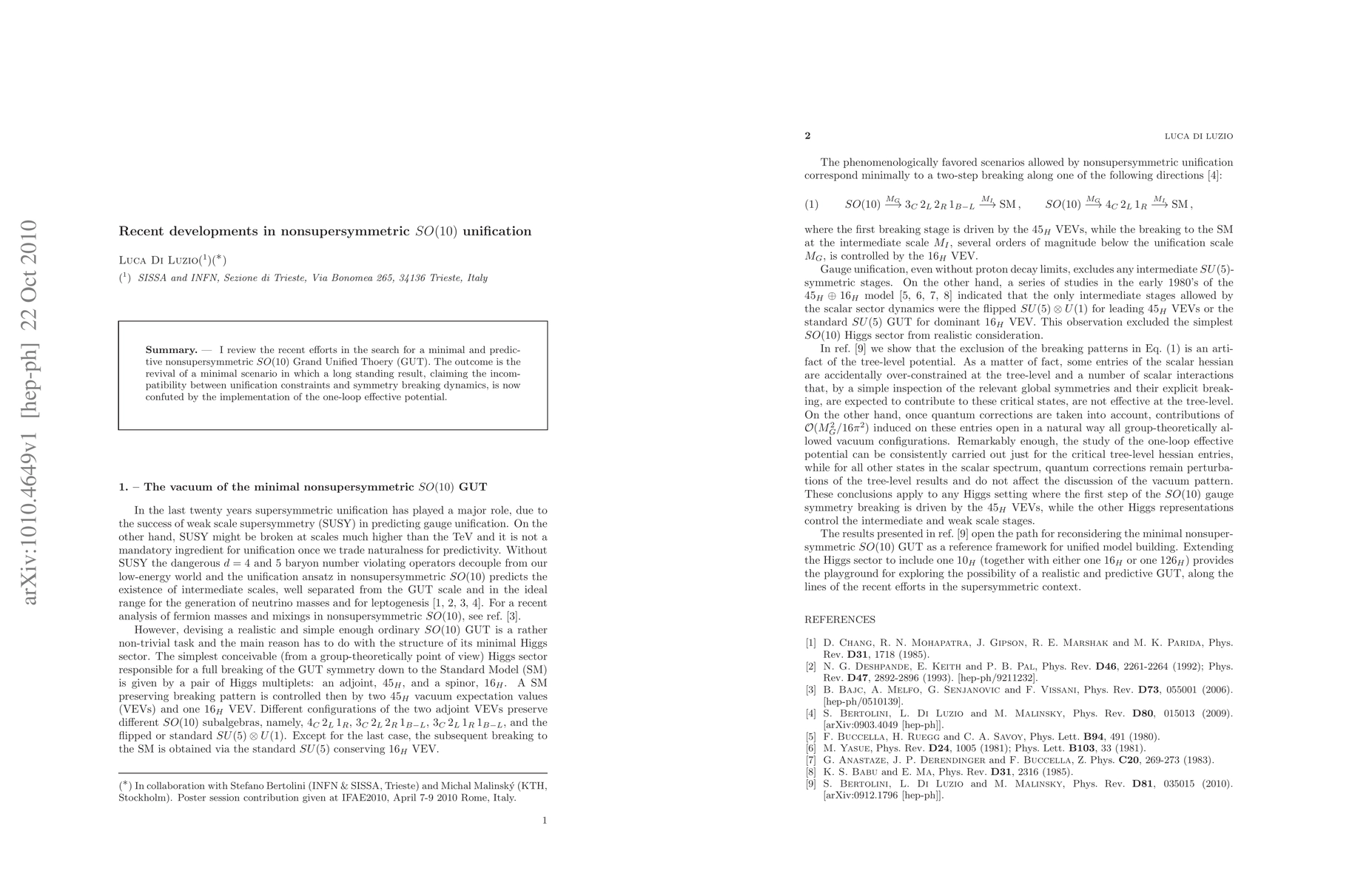 This paper reviews recent advancements in nonsupersymmetric SO(10) Grand Unified Theory (GUT), highlighting the revival of a minimal scenario that successfully reconciles unification constraints with symmetry breaking dynamics through the use of one-loop effective potential.