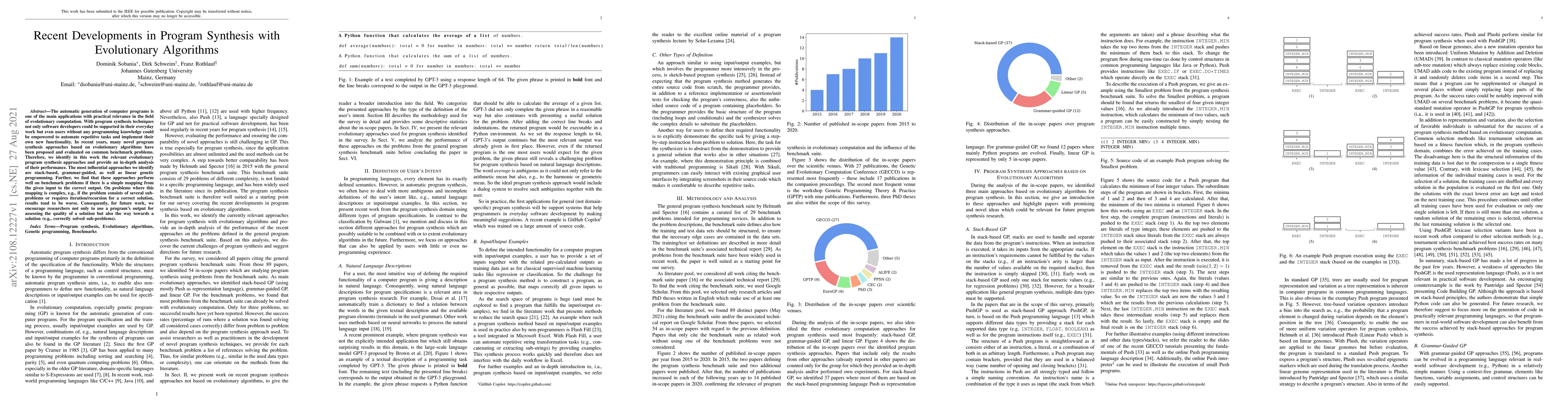 The paper identifies and analyzes recent developments in program synthesis using evolutionary algorithms, focusing on stack-based, grammar-guided, and linear genetic programming approaches.