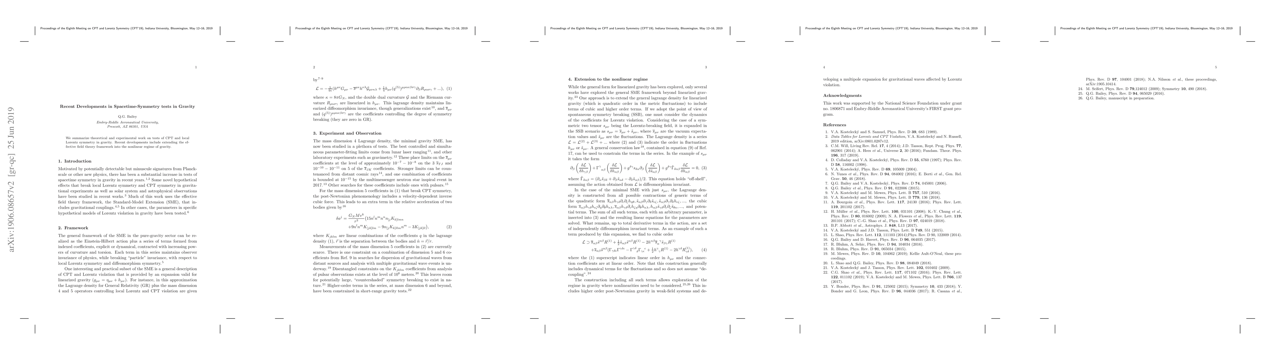 We summarize theoretical and experimental work on tests of CPT and local Lorentz symmetry in gravity. Recent developments include extending the effective field theory framework into the nonlinear regime of gravity.