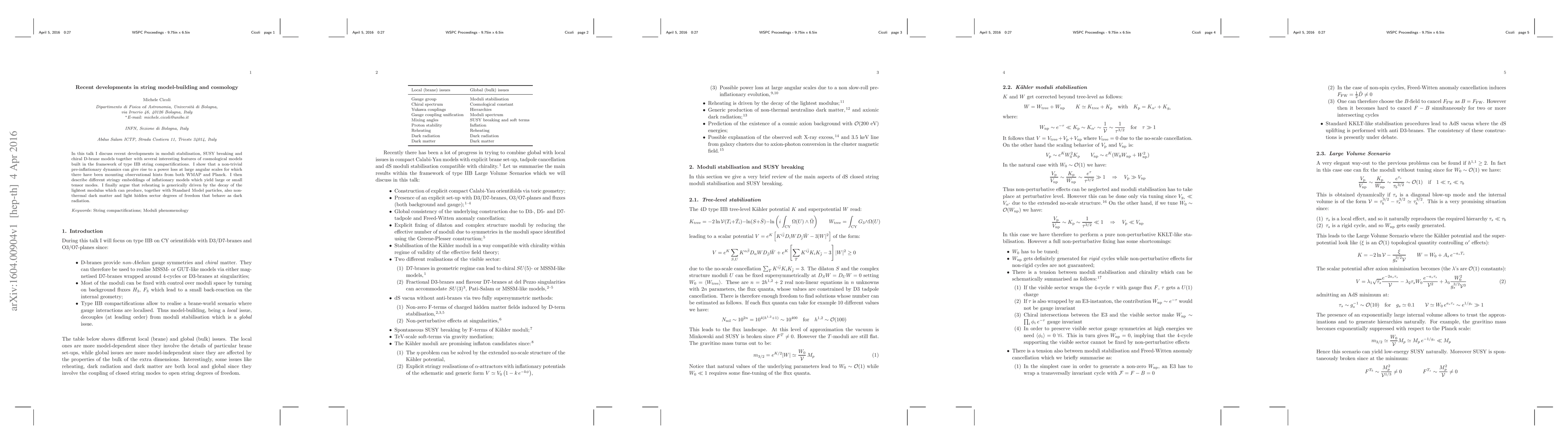 In this talk I discuss recent developments in moduli stabilisation, SUSY breaking and chiral D-brane models together with several interesting features of cosmological models built in the framework of type IIB string compactifications. I show that a non-trivial pre-inflationary dynamics can give rise to a power loss at large angular scales for which there have been mounting observational hints from both WMAP and Planck. I then describe different stringy embeddings of inflationary models which yield large or small tensor modes. I finally argue that reheating is generically driven by the decay of the lightest modulus which can produce, together with Standard Model particles, also non-thermal dark matter and light hidden sector degrees of freedom that behave as dark radiation.