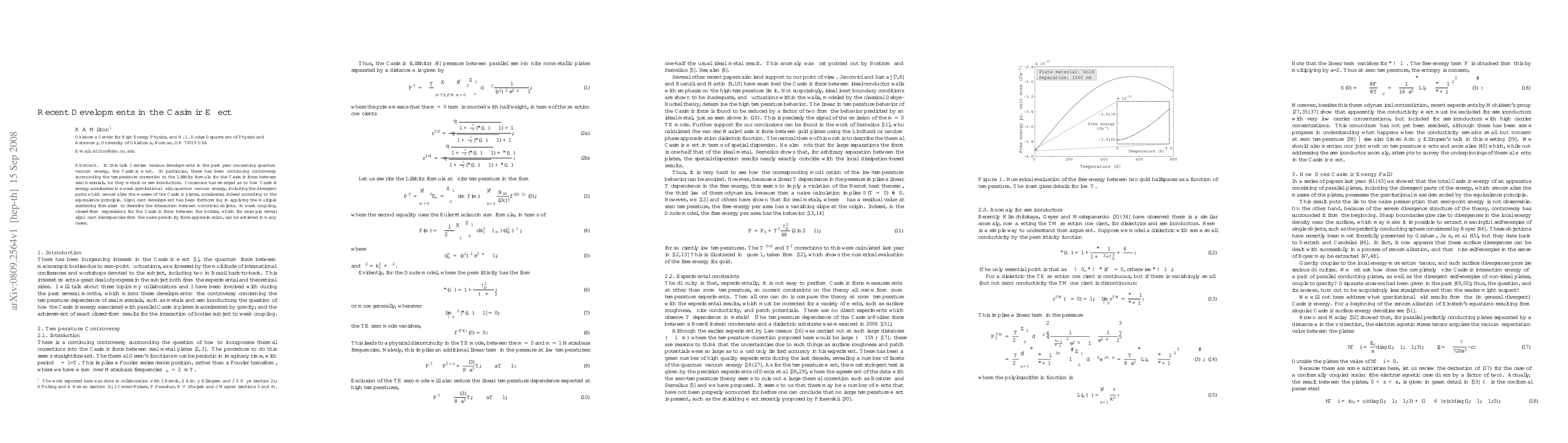 In this talk I review various developments in the past year concerning quantum vacuum energy, the Casimir effect. In particular, there has been continuing controversy surrounding the temperature correction to the Lifshitz formula for the Casimir force between real materials, be they metals or semiconductors. Consensus has emerged as to how Casimir energy accelerates in a weak gravitational field; quantum vacuum energy, including the divergent parts which renormalize the masses of the Casimir plates, accelerates indeed according to the equivalence principle. Significant development has been forthcoming in applying the multiple scattering formalism to describe the interaction between nontrivial objects. In weak coupling, closed-form expressions for the Casimir force between the bodies, which for example reveal significant discrepancies from the naive proximity force approximation, can be achieved in many cases.