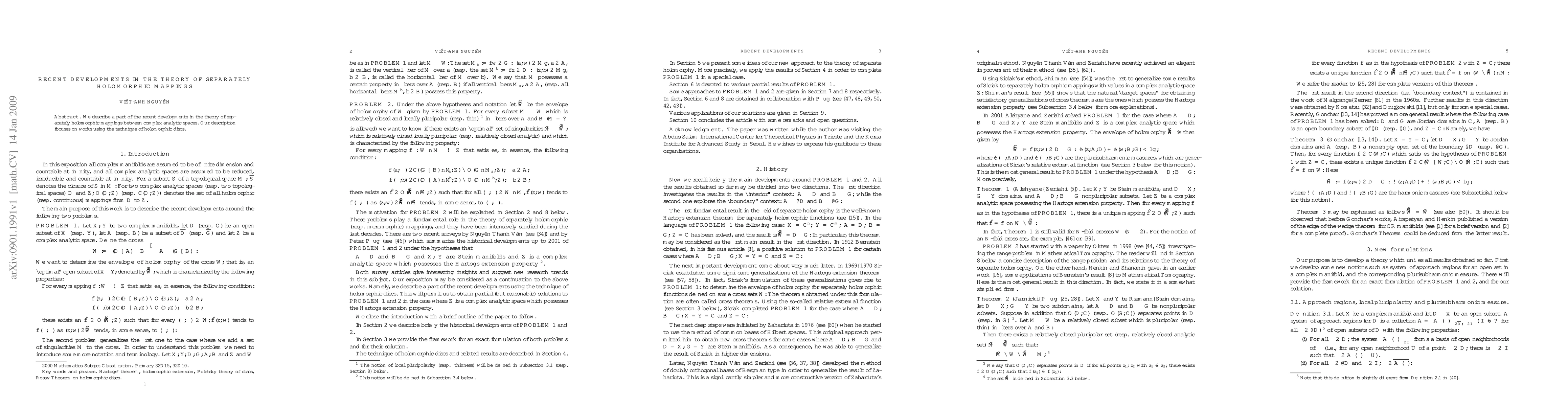 This paper outlines advancements in the theory of separately holomorphic mappings, specifically those employing holomorphic discs technique. It highlights recent studies in this area, emphasizing methodological shifts rather than detailed findings.