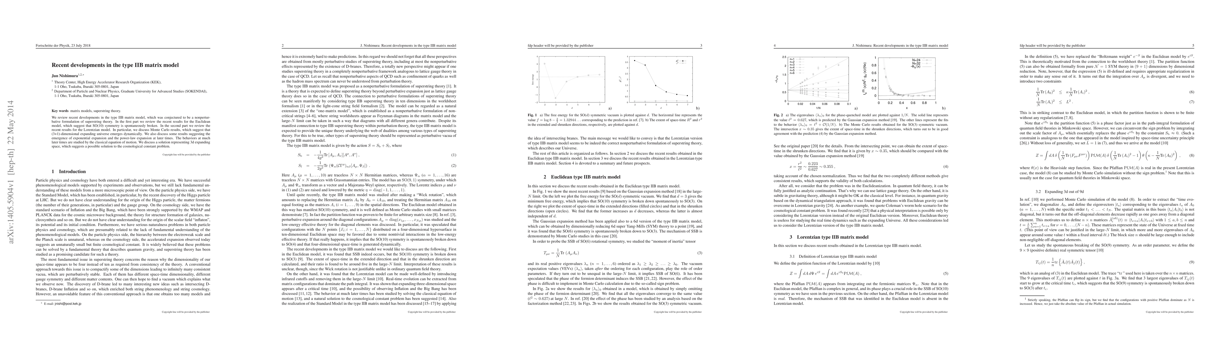 This paper reviews recent advancements in the type IIB matrix model, focusing on its potential as a nonperturbative superstring theory formulation. It highlights the spontaneous breaking of SO(10) symmetry in the Euclidean model and explores the emergence of a (3+1)-dimensional expanding universe, exponential expansion, and power-law expansion in the Lorentzian model, with classical solutions suggesting a resolution to the cosmological constant problem.