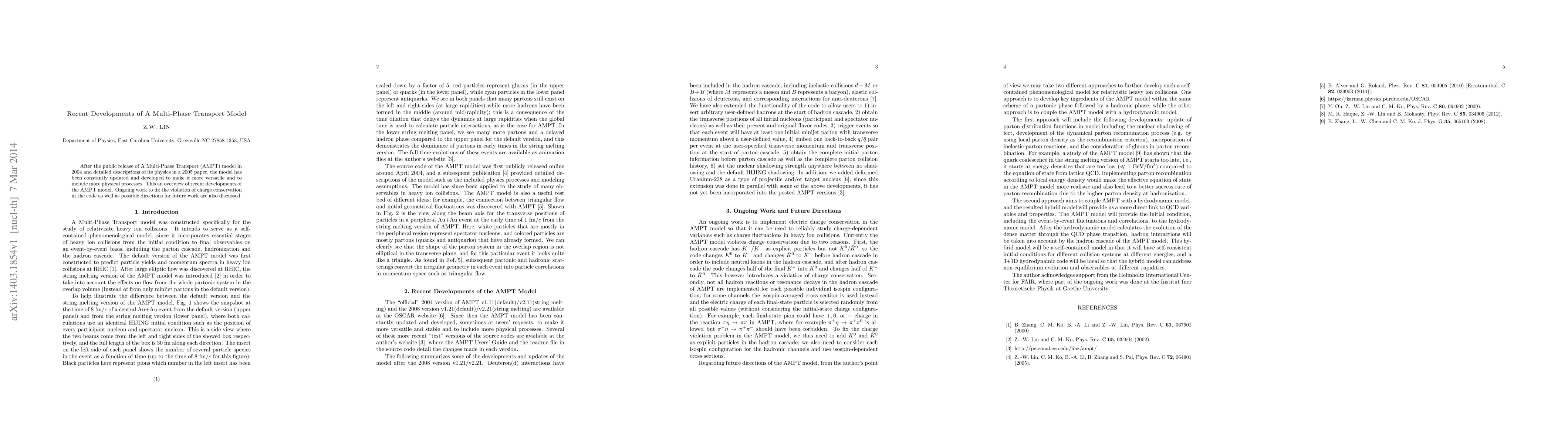 After the public release of A Multi-Phase Transport (AMPT) model in 2004 and detailed descriptions of its physics in a 2005 paper, the model has been constantly updated and developed to make it more versatile and to include more physical processes. This an overview of recent developments of the AMPT model. Ongoing work to fix the violation of charge conservation in the code as well as possible directions for future work are also discussed.