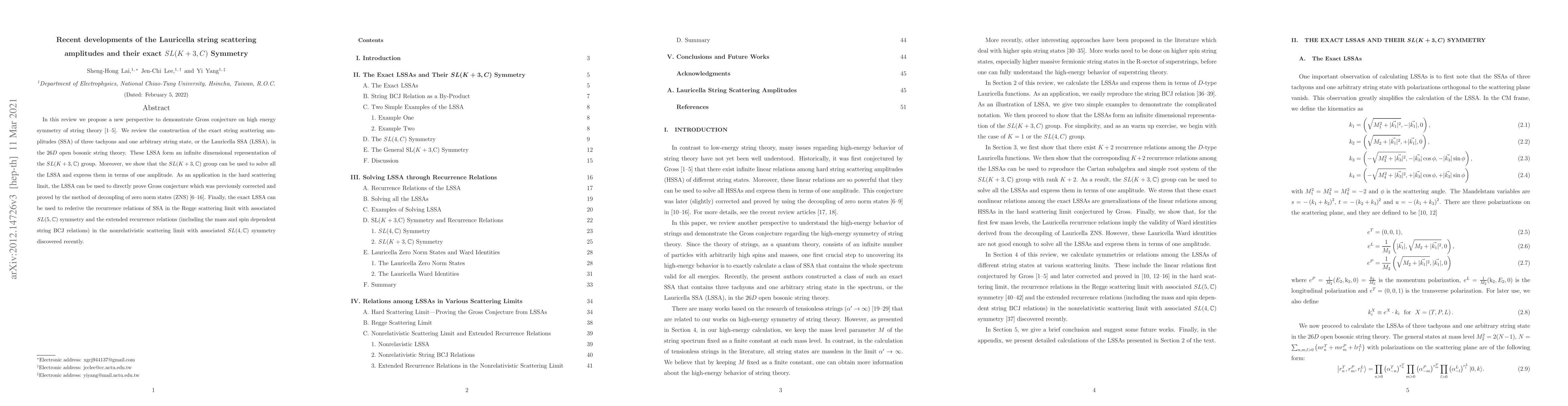 In this review we propose a new perspective to demonstrate Gross conjecture on high energy symmetry of string theory. We review the construction of the exact string scattering amplitudes (SSA) of three tachyons and one arbitrary string state, or the Lauricella SSA (LSSA), in the 26D open bosonic string theory. These LSSA form an infinite dimensional representation of the SL(K+3,C) group. Moreover, we show that the SL(K+3,C) group can be used to solve all the LSSA and express them in terms of one amplitude. As an application in the hard scattering limit, the LSSA can be used to directly prove Gross conjecture which was previously corrected and proved by the method of decoupling of zero norm states (ZNS). Finally, the exact LSSA can be used to rederive the recurrence relations of SSA in the Regge scattering limit with associated SL(5,C) symmetry and the extended recurrence relations (including the mass and spin dependent string BCJ relations) in the nonrelativistic scattering limit with associated SL(4,C) symmetry discovered recently.