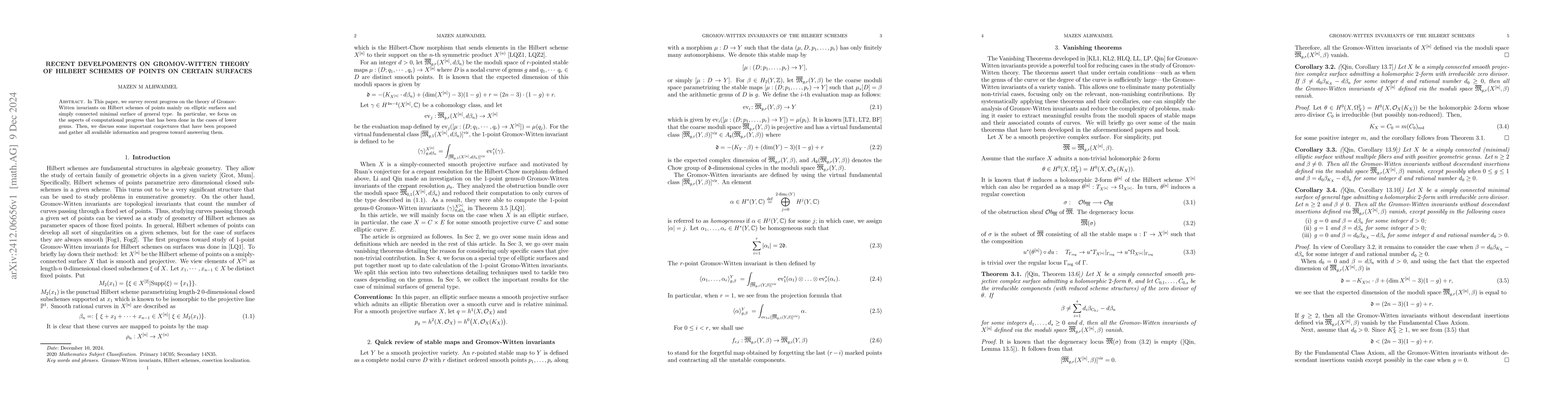 This paper reviews advances in Gromov-Witten invariants on Hilbert schemes of points on elliptic surfaces and simply connected minimal surfaces. It highlights computational progress for lower genus cases and discusses key conjectures, compiling existing information and advancements.