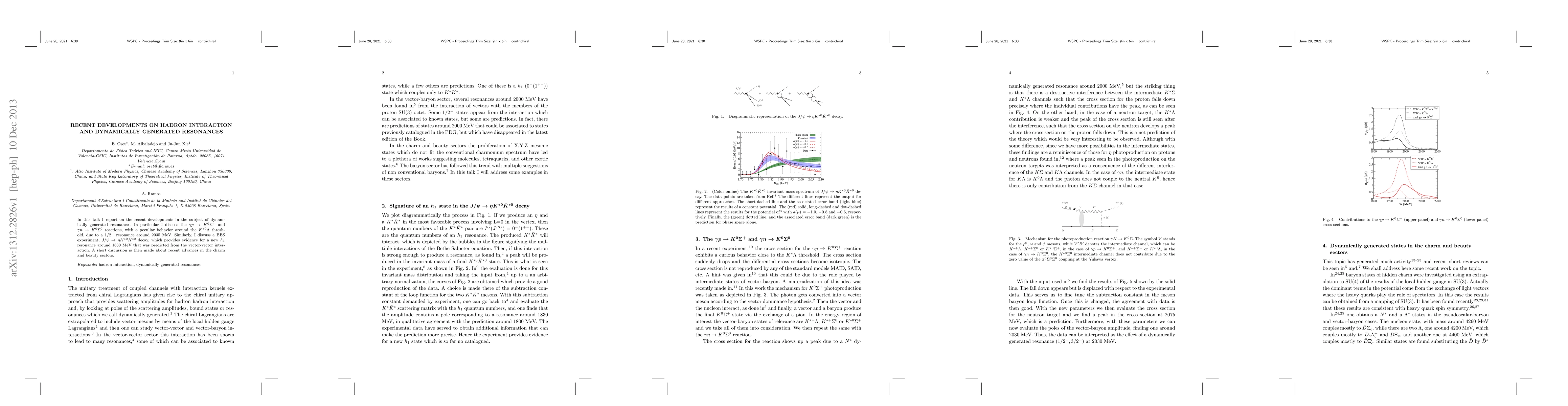 In this talk I report on the recent developments in the subject of dynamically generated resonances. In particular I discuss the $\gamma p \to K^0 \Sigma^+$ and $\gamma n \to K^0 \Sigma^0$ reactions, with a peculiar behavior around the $K^{*0} \Lambda$ threshold, due to a $1/2^-$ resonance around 2035 MeV. Similarly, I discuss a BES experiment, $J/\psi \to \eta K^{*0} \bar K^{*0}$ decay, which provides evidence for a new $h_1$ resonance around 1830 MeV that was predicted from the vector-vector interaction. A short discussion is then made about recent advances in the charm and beauty sectors.