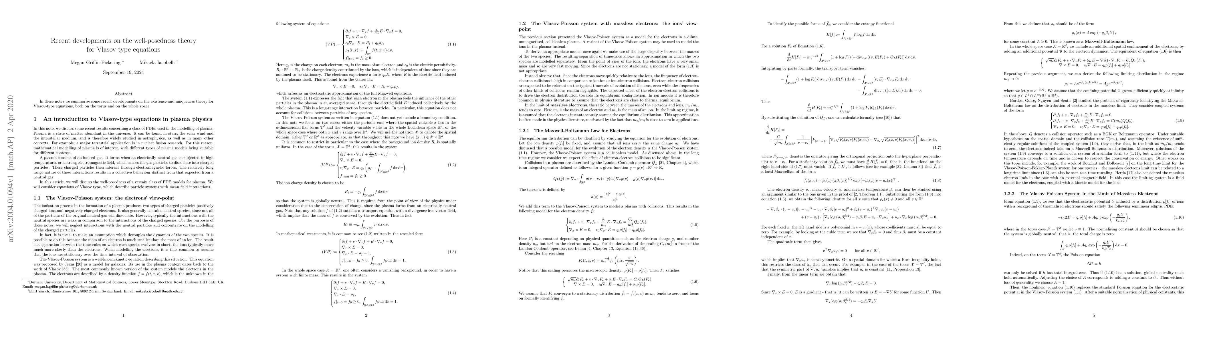 This paper summarizes recent developments in the existence and uniqueness theory for Vlasov-type equations on both torus and whole space, focusing on key findings and implications.