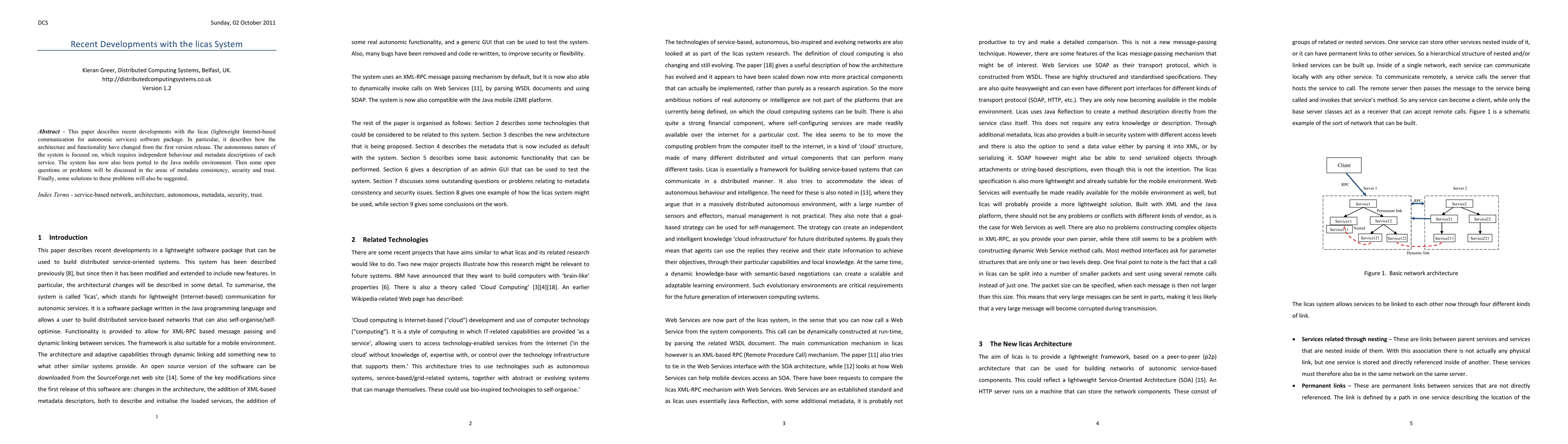This paper describes recent developments with the licas (lightweight Internet-based communication for autonomic services) software package. In particular, it describes how the architecture and functionality have changed from the first version release. The autonomous nature of the system is focused on, which requires independent behaviour and metadata descriptions of each service. The system has now also been ported to the Java mobile environment. Then some open questions or problems will be discussed in the areas of metadata consistency, security and trust. Finally, some solutions to these problems will also be suggested.