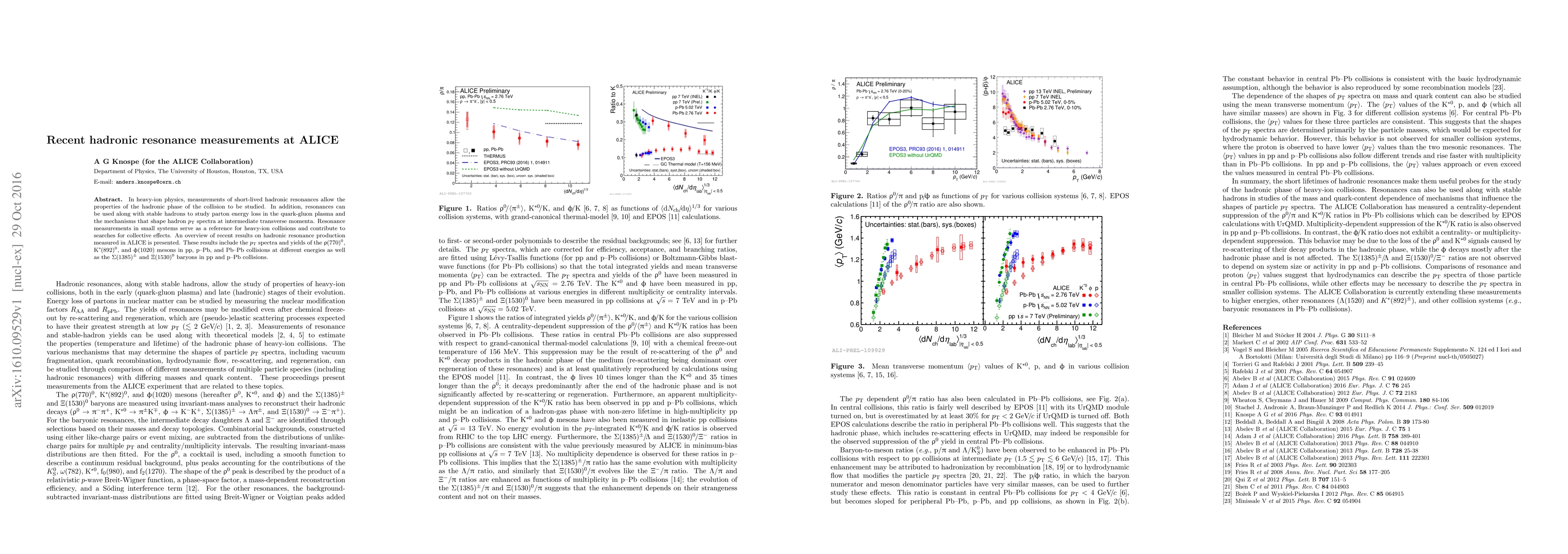 In heavy-ion physics, measurements of short-lived hadronic resonances allow the properties of the hadronic phase of the collision to be studied. In addition, resonances can be used along with stable hadrons to study parton energy loss in the quark-gluon plasma and the mechanisms that shape hadron pT spectra at intermediate transverse momenta. Resonance measurements in small systems serve as a reference for heavy-ion collisions and contribute to searches for collective effects. An overview of recent results on hadronic resonance production measured in ALICE is presented. These results include the pT spectra and yields of the rho(770)0, K*(892)0, and phi(1020) mesons in pp, p-Pb, and Pb-Pb collisions at different energies as well as the Sigma(1385)+/- and Xi(1530)0 baryons in pp and p-Pb collisions.