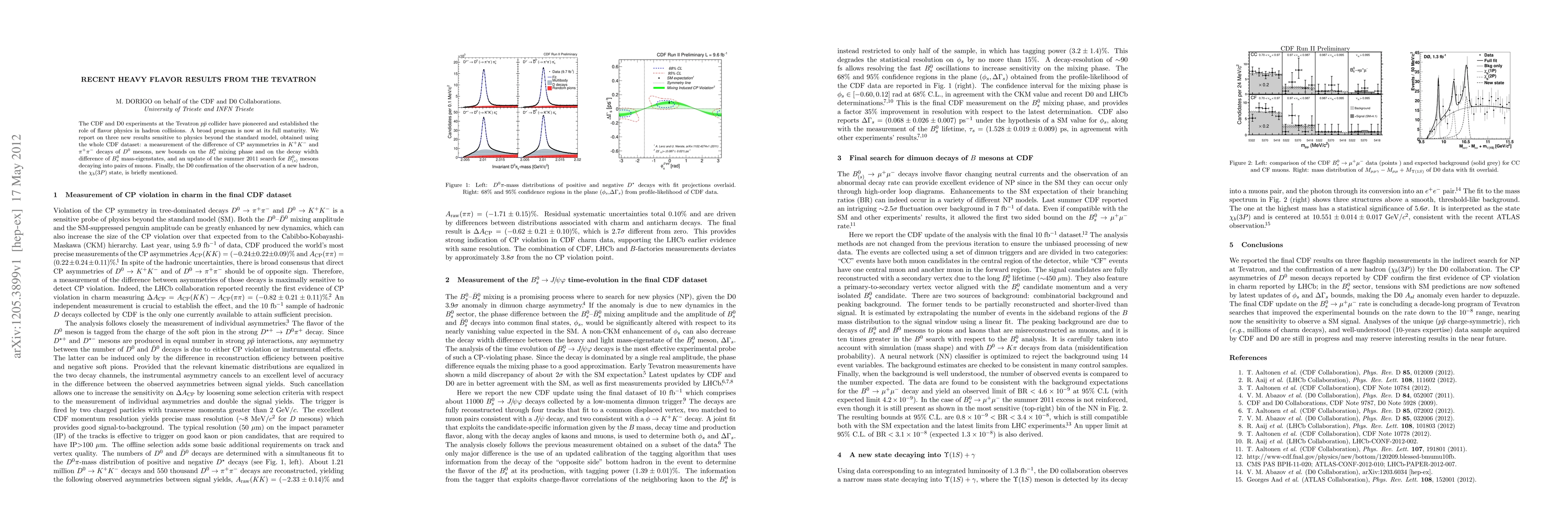 The CDF and D0 experiments at the Tevatron ppbar collider have pioneered and established the role of flavor physics in hadron collisions. A broad program is now at its full maturity. We report on three new results sensitive to physics beyond the standard model, obtained using the whole CDF dataset: a measurement of the difference of CP asymmetries in $K^+K^-$ and $\pi^+\pi^-$ decays of $D^0$ mesons, new bounds on the $B^0_s$ mixing phase and on the decay width difference of $B^0_s$ mass-eigenstates, and an update of the summer 2011 search for $B^0_(s)$ mesons decaying into pairs of muons. Finally, the D0 confirmation of the observation of a new hadron, the $\chi_b(3P)$ state, is briefly mentioned.