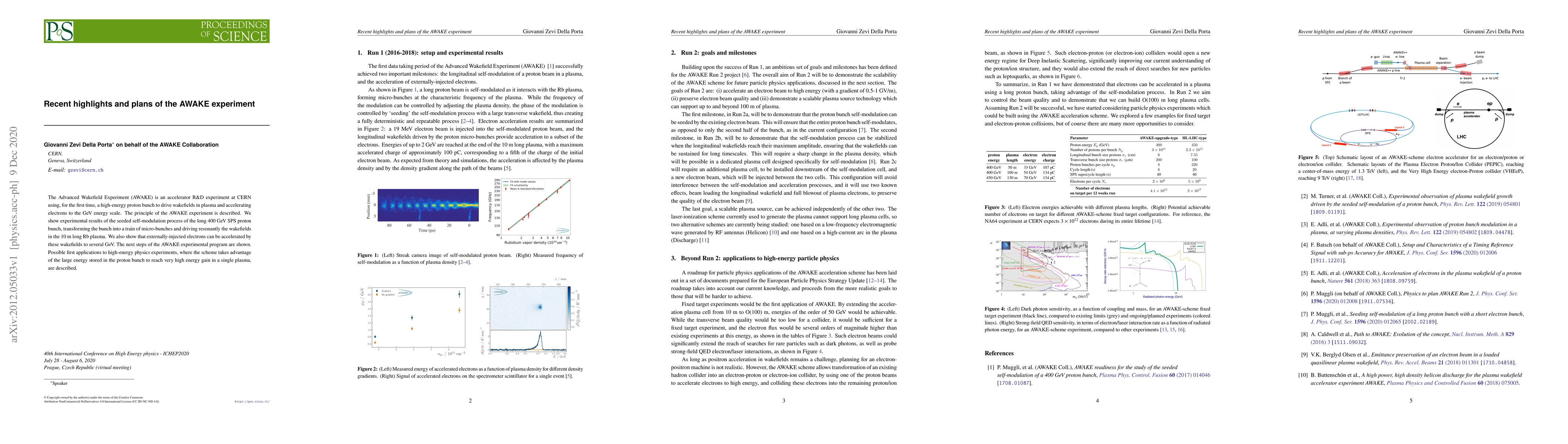 The AWAKE experiment at CERN uses high-energy proton bunches to drive wakefields in plasma, accelerating electrons to GeV scales. Initial results demonstrate the transformation of proton bunches into micro-bunches and the acceleration of injected electrons to several GeV, with future plans to apply this technology to high-energy physics experiments.