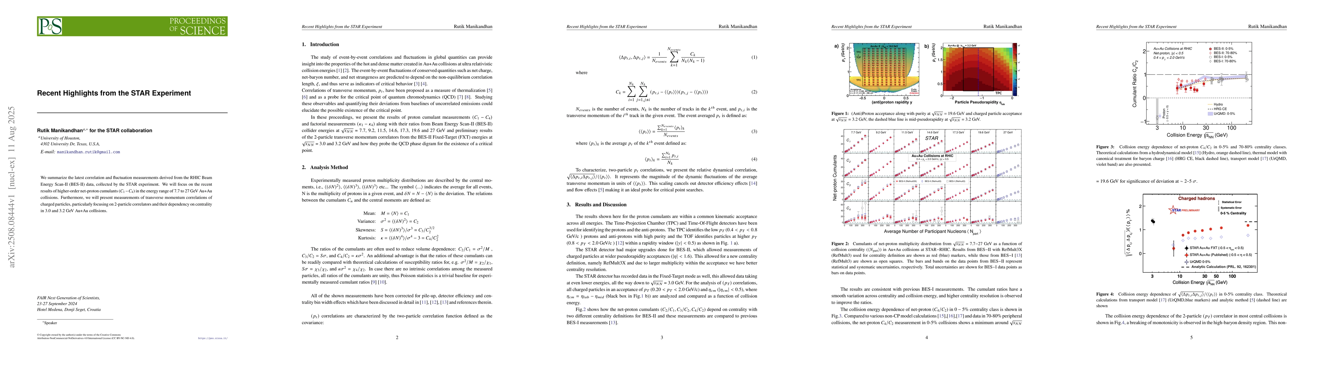 The STAR experiment at RHIC collected BES-II data for Au+Au collisions in the energy range of 7.7 to 27 GeV, focusing on higher-order net-proton cumulants (C1-C4) and transverse momentum correlations of charged particles, particularly 2-particle correlators in 3.0 and 3.2 GeV Au+Au collisions.