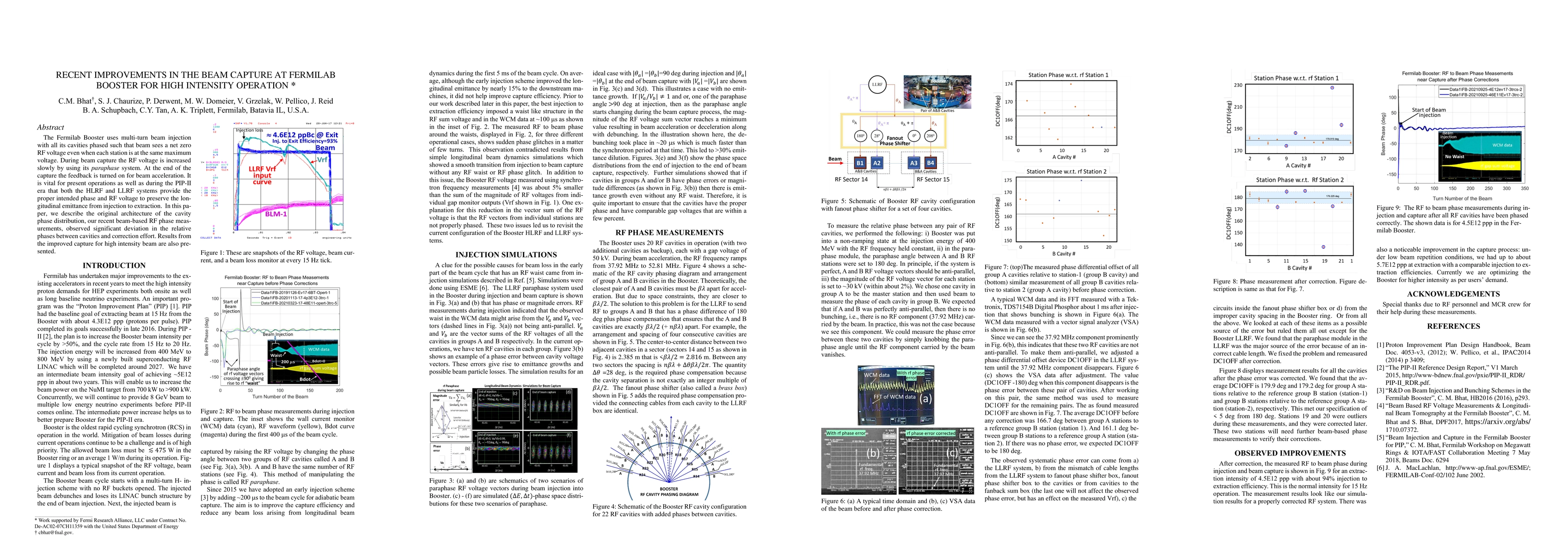 The Fermilab Booster uses multi-turn beam injection with all its cavities phased such that beam sees a net zero RF voltage even when each station is at the same maxi-mum voltage. During beam capture the RF voltage is increased slowly by using its paraphase system. At the end of the capture the feedback is turned on for beam acceleration. It is vital for present operations as well as during the PIP-II era that both the HLRF and LLRF systems provide the proper intended phase and RF voltage to preserve the longitudinal emittance from injection to extraction. In this paper, we describe the original architecture of the cavity phase distribution, our recent beam-based RF phase measurements, observed significant deviation in the relative phases between cavities and correction effort. Results from the improved capture for high intensity beam are also presented.