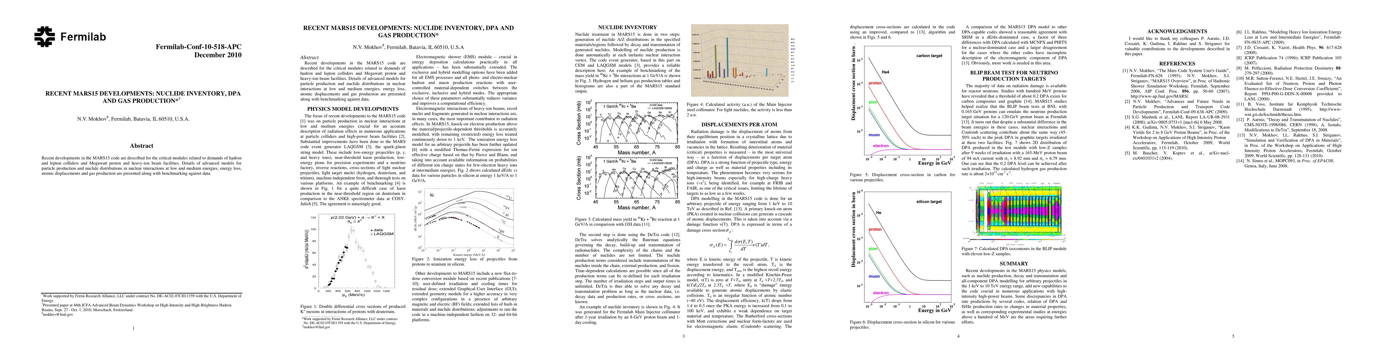 Summary: The MARS15 code has been updated with advanced models for particle production, nuclide distributions, and gas production in nuclear interactions, with a focus on hadron and lepton colliders and proton/heavy-ion beam facilities, and has been benchmarked against experimental data.