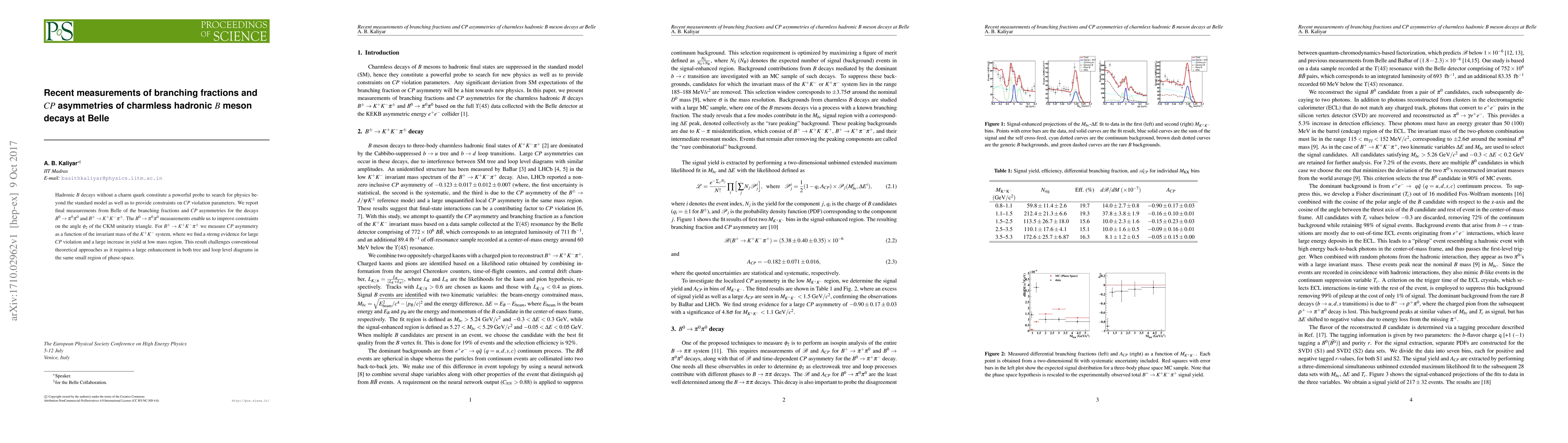 Hadronic $B$ decays without a charm quark constitute a powerful probe to search for physics beyond the standard model as well as to provide constraints on $CP$ violation parameters. We report final measurements from Belle of the branching fractions and $CP$ asymmetries for the decays $B^{0} \rightarrow \pi^{0} \pi^{0}$ and $B^{\pm} \rightarrow K^{+} K^{-} \pi^{\pm}$. The $B^{0} \rightarrow \pi^{0} \pi^{0}$ measurements enable us to improve constraints on the angle $\phi_{2}$ of the CKM unitarity triangle. For $B^{\pm} \rightarrow K^{+} K^{-} \pi^{\pm}$ we measure $CP$ asymmetry as a function of the invariant mass of the $K^{+}K^{-}$ system, where we find a strong evidence for large $CP$ violation and a large increase in yield at low mass region. This result challenges conventional theoretical approaches as it requires a large enhancement in both tree and loop level diagrams in the same small region of phase-space.