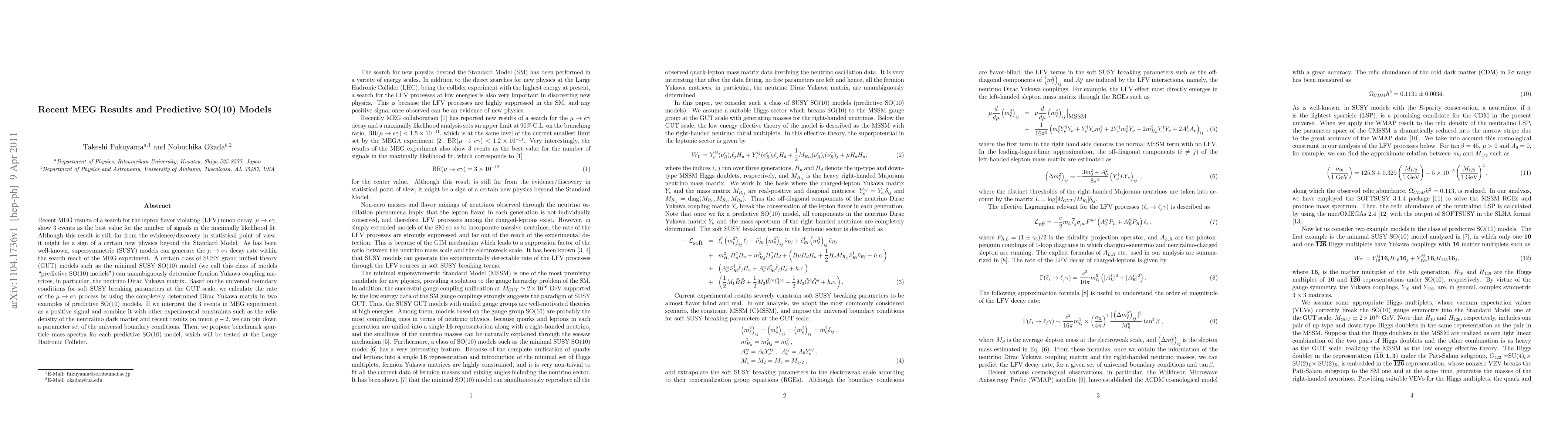 This paper discusses recent MEG results indicating a possible lepton flavor violating decay, $\mu \to e \gamma$, with three observed events, hinting at new physics beyond the Standard Model. It explores predictive SO(10) models within SUSY GUT frameworks to determine fermion Yukawa couplings and proposes benchmark sparticle mass spectra for future collider tests.