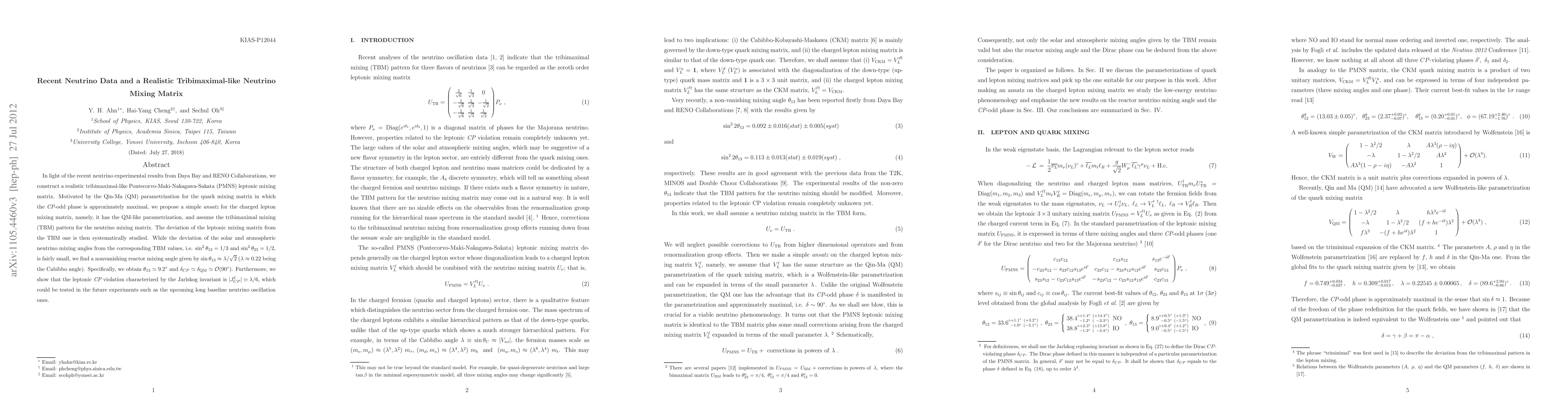 In light of the recent neutrino experimental results from Daya Bay and RENO Collaborations, we construct a realistic tribimaximal-like Pontecorvo-Maki-Nakagawa-Sakata (PMNS) leptonic mixing matrix. Motivated by the Qin-Ma (QM) parametrization for the quark mixing matrix in which the CP-odd phase is approximately maximal, we propose a simple ansatz for the charged lepton mixing matrix, namely, it has the QM-like parametrization, and assume the tribimaximal mixing (TBM) pattern for the neutrino mixing matrix. The deviation of the leptonic mixing matrix from the TBM one is then systematically studied. While the deviation of the solar and atmospheric neutrino mixing angles from the corresponding TBM values, i.e. $\sin^2\theta_{12}=1/3$ and $\sin^2\theta_{23}=1/2$, is fairly small, we find a nonvanishing reactor mixing angle given by $\sin\theta_{13}\approx \lambda/\sqrt{2}$ ($\lambda\approx 0.22$ being the Cabibbo angle). Specifically, we obtain $\theta_{13}\simeq 9.2^{\circ}$ and $\delta_{CP} \simeq \delta_{\rm QM} \simeq {\cal O}(90^{\circ})$. Furthermore, we show that the leptonic \CP violation characterized by the Jarlskog invariant is $|J^{\ell}_{CP}|\simeq \lambda/6$, which could be tested in the future experiments such as the upcoming long baseline neutrino oscillation ones.