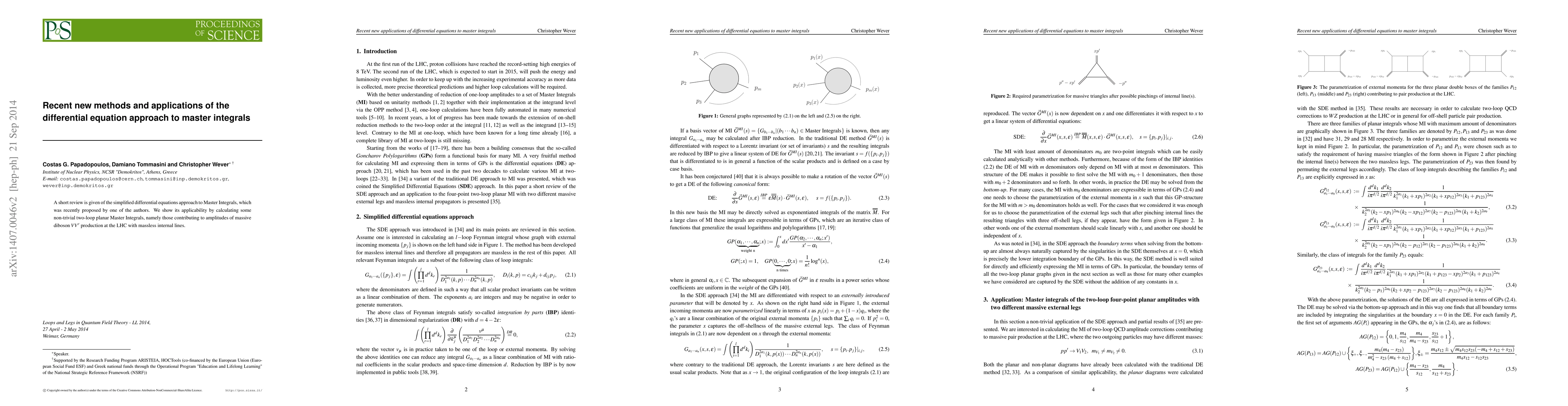 This paper reviews a novel differential equation method for calculating Master Integrals, demonstrating its effectiveness through the computation of non-trivial two-loop planar integrals relevant to massive diboson production amplitudes at the LHC.
