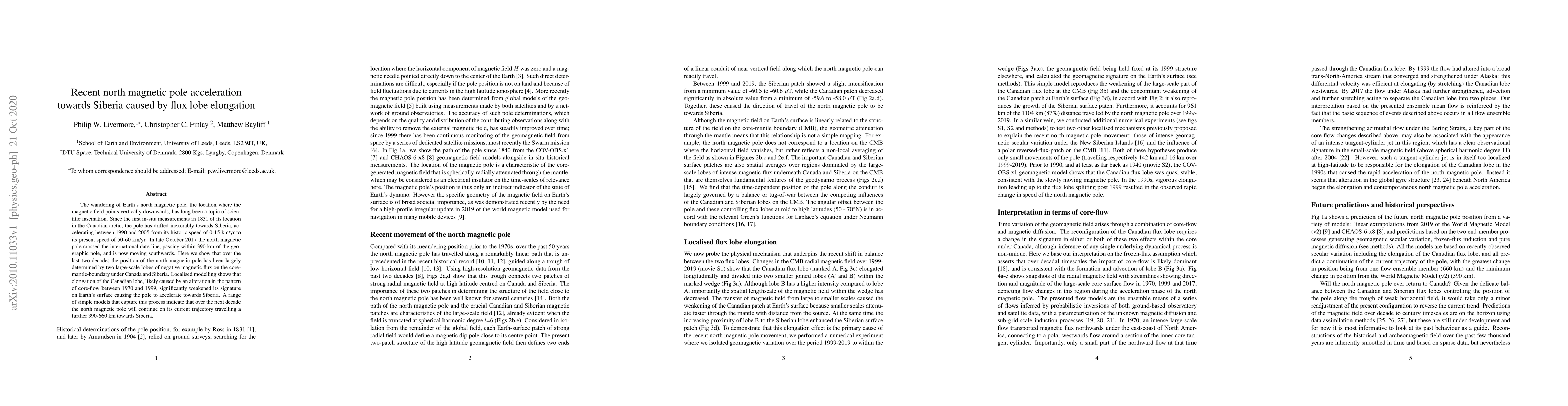 The wandering of Earth's north magnetic pole, the location where the magnetic field points vertically downwards, has long been a topic of scientific fascination. Since the first in-situ measurements in 1831 of its location in the Canadian arctic, the pole has drifted inexorably towards Siberia, accelerating between 1990 and 2005 from its historic speed of 0-15 km/yr to its present speed of 50-60 km/yr. In late October 2017 the north magnetic pole crossed the international date line, passing within 390 km of the geographic pole, and is now moving southwards. Here we show that over the last two decades the position of the north magnetic pole has been largely determined by two large-scale lobes of negative magnetic flux on the core-mantle-boundary under Canada and Siberia. Localised modelling shows that elongation of the Canadian lobe, likely caused by an alteration in the pattern of core-flow between 1970 and 1999, significantly weakened its signature on Earth's surface causing the pole to accelerate towards Siberia. A range of simple models that capture this process indicate that over the next decade the north magnetic pole will continue on its current trajectory travelling a further 390-660 km towards Siberia.