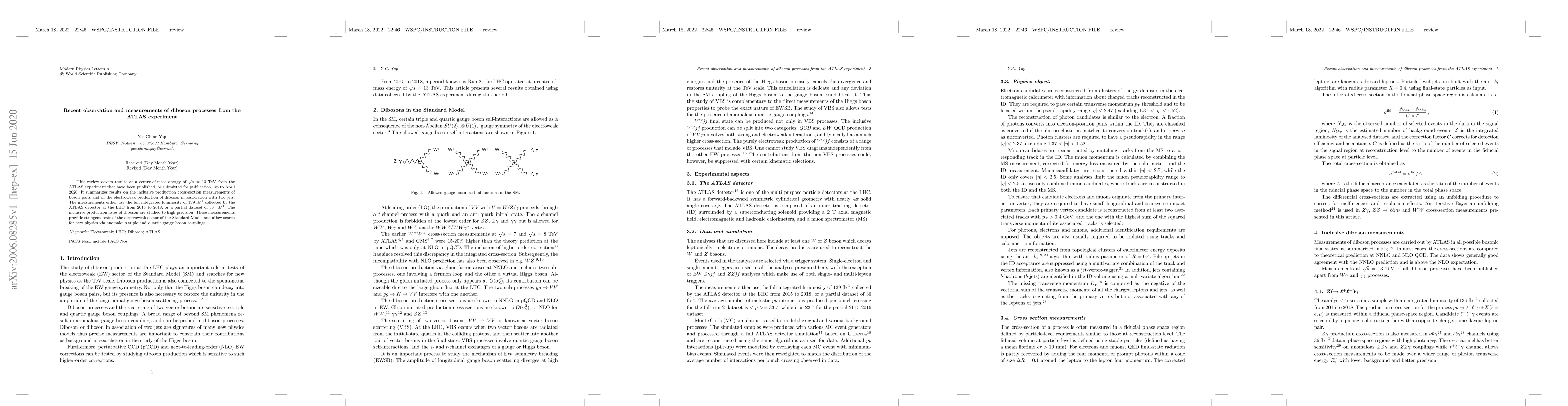 This review covers results at a centre-of-mass energy of $\sqrt{s}=13$ TeV from the ATLAS experiment that have been published, or submitted for publication, up to April 2020. It summarizes results on the inclusive production cross-section measurements of boson pairs and of the electroweak production of diboson in association with two jets. The measurements either use the full integrated luminosity of 139 $\text{fb}^\text{-1}$ collected by the ATLAS detector at the LHC from 2015 to 2018, or a partial dataset of 36 $\text{fb}^\text{-1}$. The inclusive production rates of diboson are studied to high precision. These measurements provide stringent tests of the electroweak sector of the Standard Model and allow search for new physics via anomalous triple and quartic gauge boson couplings.
