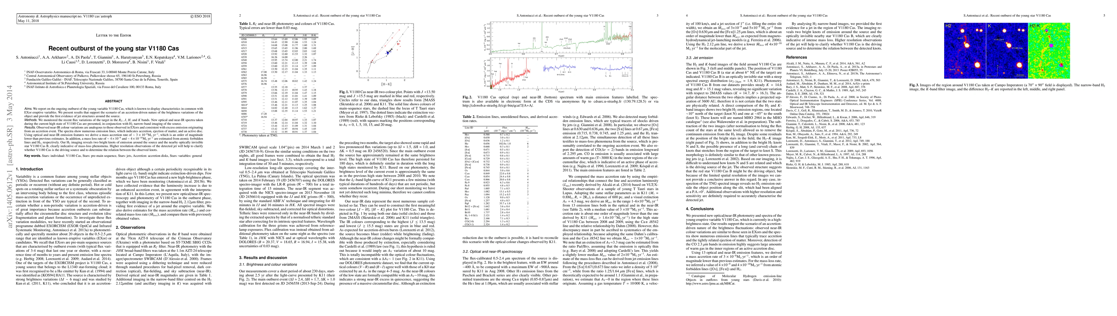 We report on the ongoing outburst of the young variable V1180 Cas, which is known to display characteristics in common with EXor eruptive variables. We present results that support the scenario of an accretion-driven nature of the brightness variations of the object and provide the first evidence of jet structures around the source. We monitored the recent flux variations of the target in the Rc, J, H, and K bands. New optical and near-IR spectra taken during the current high state of V1180 Cas are presented, in conjunction with H2 narrow-band imaging of the source. Observed near-IR colour variations are analogous to those observed in EXors and consistent with excess emission originating from an accretion event. The spectra show numerous emission lines, which indicates accretion, ejection of matter, and an active disc. Using optical and near-IR emission features we derive a mass accretion rate of ~3 E-8 Msun/yr, which is an order of magnitude lower than previous estimates. In addition, a mass loss rate of ~4 E-9 and ~4 E-10 Msun/yr are estimated from atomic forbidden lines and H2, respectively. Our H2 imaging reveals two bright knots of emission around the source and the nearby optically invisible star V1180 Cas B, clearly indicative of mass-loss phenomena. Higher resolution observations of the detected jet will help to clarify whether V1180 Cas is the driving source and to determine the relation between the observed knots.