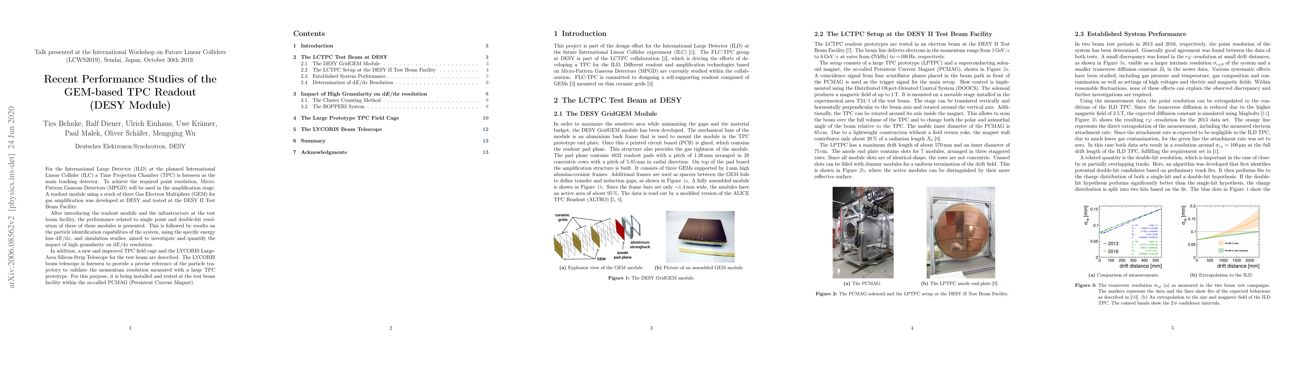 This paper presents performance studies of a GEM-based TPC readout module developed for the ILD detector at the ILC, focusing on single and double-hit resolution, particle identification via dE/dx, and the impact of high granularity. Additionally, it introduces an improved TPC field cage and a new silicon-strip telescope for precise trajectory validation.