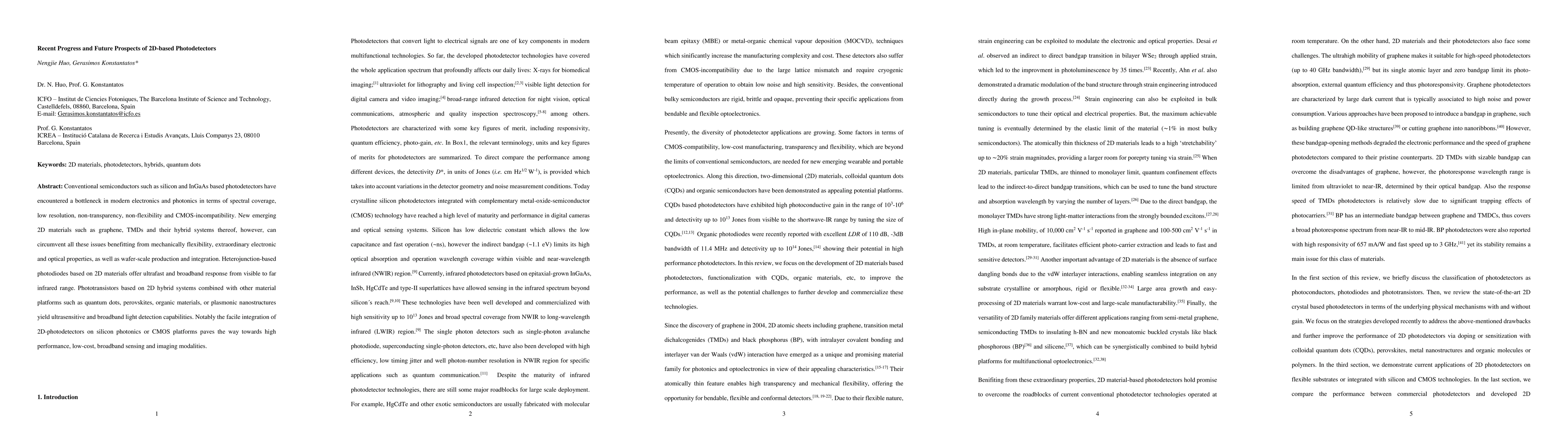Conventional semiconductors such as silicon and InGaAs based photodetectors have encountered a bottleneck in modern electronics and photonics in terms of spectral coverage, low resolution, non-transparency, non-flexibility and CMOS-incompatibility. New emerging 2D materials such as graphene, TMDs and their hybrid systems thereof, however, can circumvent all these issues benefitting from mechanically flexibility, extraordinary electronic and optical properties, as well as wafer-scale production and integration. Heterojunction-based photodiodes based on 2D materials offer ultrafast and broadband response from visible to far infrared range. Phototransistors based on 2D hybrid systems combined with other material platforms such as quantum dots, perovskites, organic materials, or plasmonic nanostructures yield ultrasensitive and broadband light detection capabilities. Notably the facile integration of 2D-photodetectors on silicon photonics or CMOS platforms paves the way towards high performance, low-cost, broadband sensing and imaging modalities.