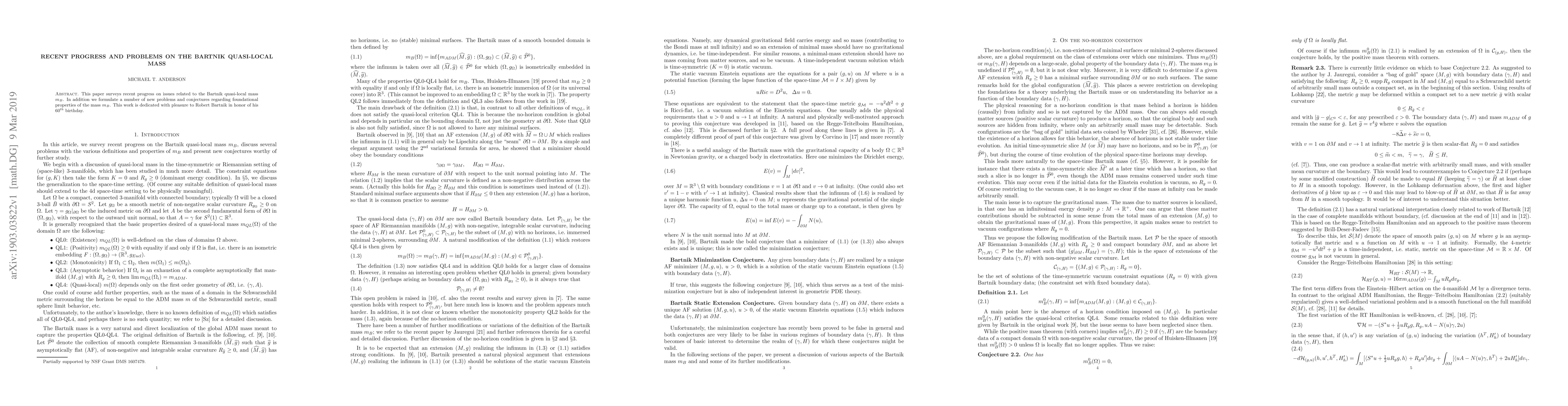This paper surveys recent progress on issues related to the Bartnik quasi-local mass $m_B$. In addition, we formulate a number of new problems and conjectures regarding foundational properties of the mass $m_B$. This work is dedicated with pleasure to Robert Bartnik in honor of his 60th birthday.