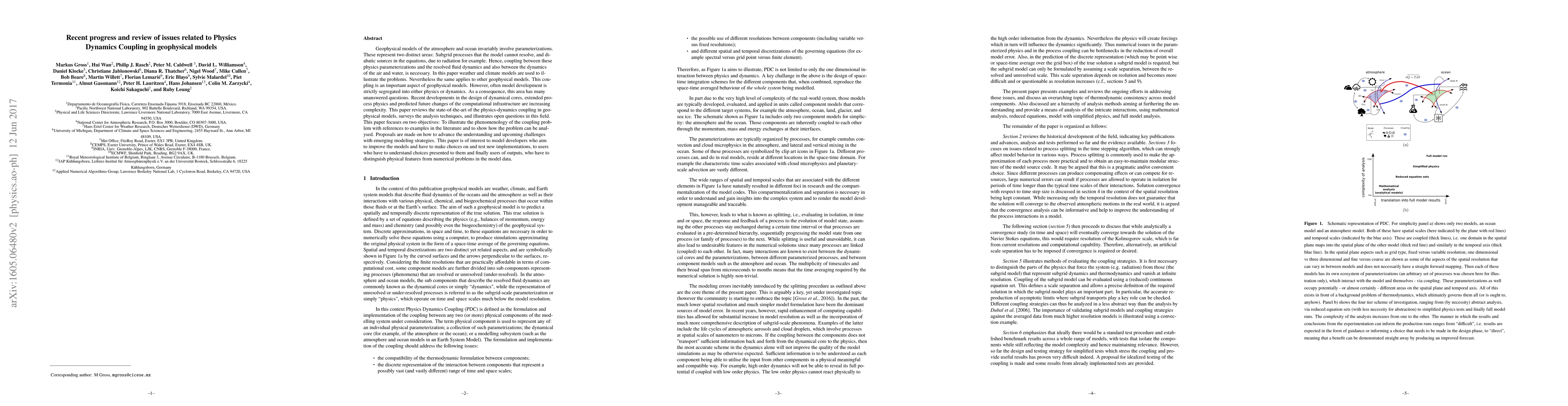 This paper reviews the state-of-the-art in physics-dynamics coupling in geophysical models, highlighting the challenges and open questions due to segregated model development. It proposes methods to advance understanding and addresses the needs of model developers, users, and output consumers.