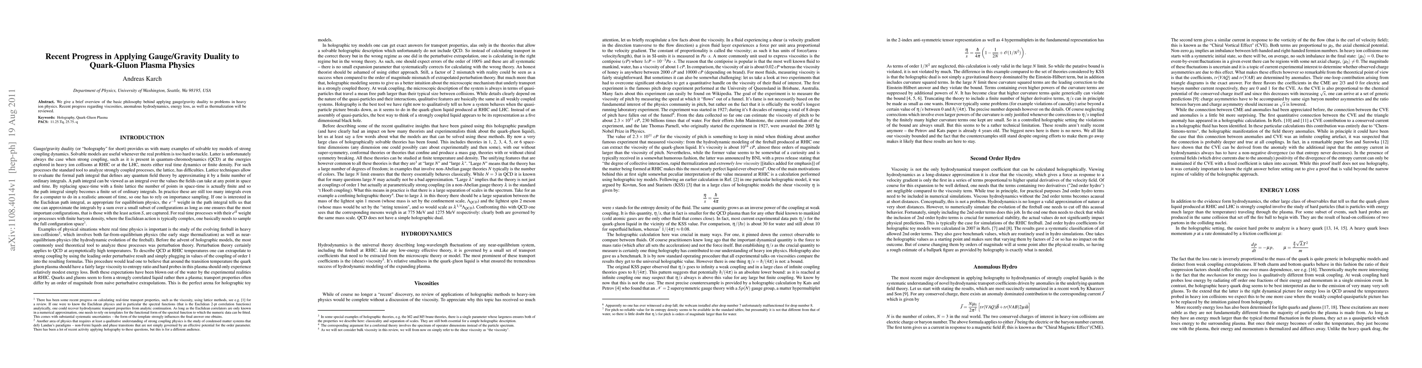 We give a brief overview of the basic philosophy behind applying gauge/gravity duality to problems in heavy ion physics. Recent progress regarding viscosities, anomalous hydrodynamics, energy loss, as well as thermalization will be reviewed.