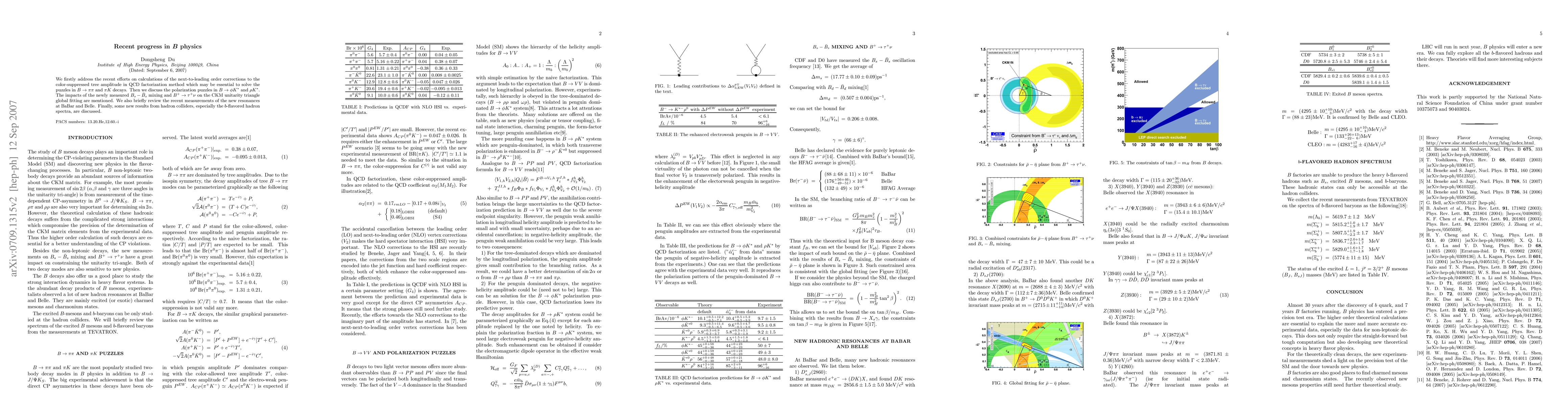 We firstly address the recent efforts on calculations of the next-to-leading order corrections to the color-suppressed tree amplitude in QCD factorization method which may be essential to solve the puzzles in $B\to \pi\pi$ and $\pi K$ decays. Then we discuss the polarization puzzles in $B\to \phi K^*$ and $\rho K^*$. The impacts of the newly measured $B_s-\bar B_s$ mixing and $B^+\to \tau^+\nu$ on the CKM unitarity triangle global fitting are mentioned. We also briefly review the recent measurements of the new resonances at BaBar and Belle. Finally, some new results from hadron colliders, especially the $b$-flavored hadron spectra, are discussed.