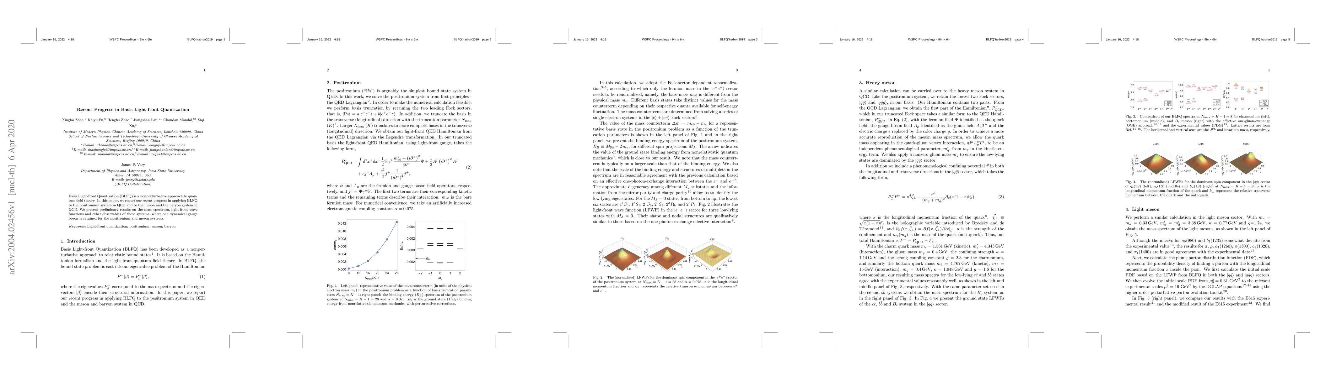 This paper discusses recent advances in Basis Light-front Quantization (BLFQ) applied to positronium in QED and meson and baryon systems in QCD, presenting preliminary results on mass spectra, light-front wave functions, and other observables. The study retains one dynamical gauge boson for positronium and meson systems.