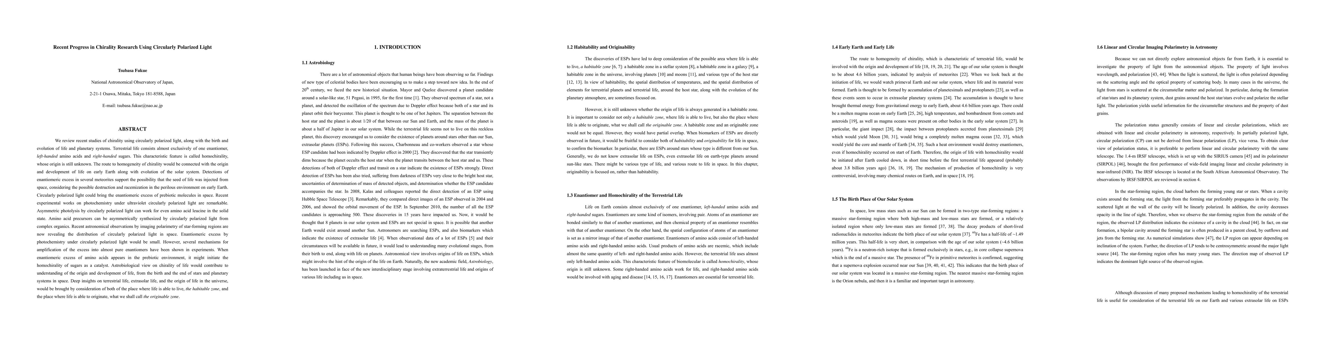 (abridged) We review recent studies of chirality using circularly polarized light, along with the birth and evolution of life and planetary systems. Terrestrial life consists almost exclusively of one enantiomer, left-handed amino acids. This characteristic feature is called homochirality, whose origin is still unknown. The route to homogeneity of chirality would be connected with the origin and development of life on early Earth along with evolution of the solar system. Detections of enantiomeric excess in several meteorites support the possibility that the seed of life was injected from space, considering the possible destruction and racemization in the perilous environment on early Earth. Circularly polarized light could bring the enantiomeric excess of prebiotic molecules in space. Recent experimental works on photochemistry under ultraviolet circularly polarized light are remarkable. Recent astronomical observations by imaging polarimetry of star-forming regions are now revealing the distribution of circularly polarized light in space. Astrobiological view on chirality of life would contribute to understanding of the origin and development of life, from the birth and the end of stars and planetary systems in space. Deep insights on terrestrial life, extrasolar life, and the origin of life in the universe, would be brought by consideration of both of the place where life is able to live, the "habitable" zone, and the place where life is able to originate, what we shall call the "originable" zone.