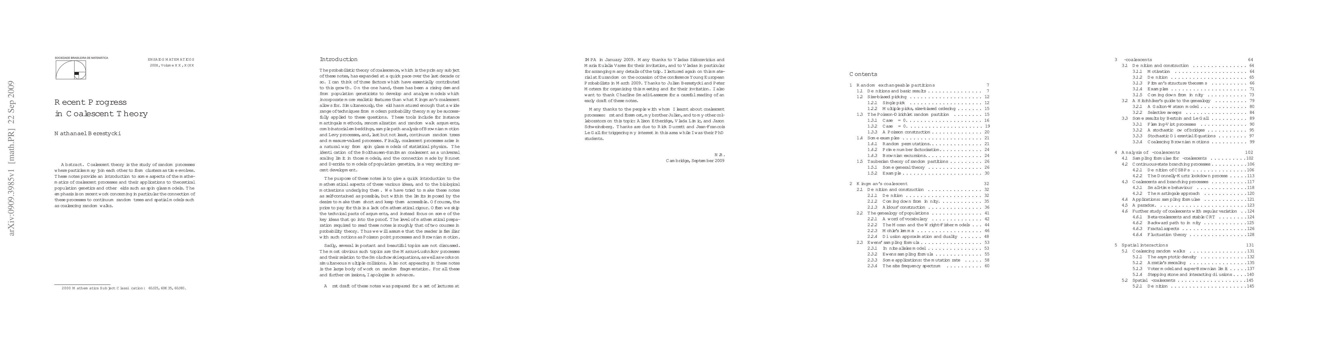 Recent progress in coalescent theory explores connections to continuum random trees and spatial models like coalescing random walks, advancing our understanding of random processes that form clusters as time evolves.