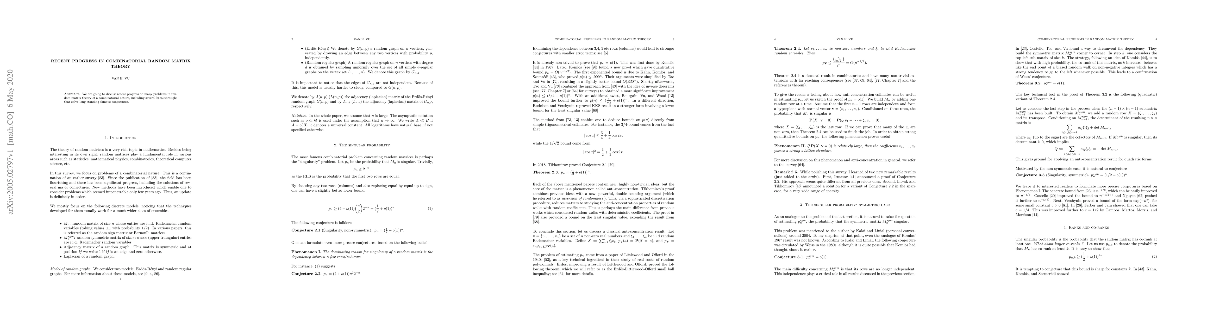 We discuss recent progress many problems in random matrix theory of a combinatorial nature, including several breakthroughs that solve long standing famous conjectures.