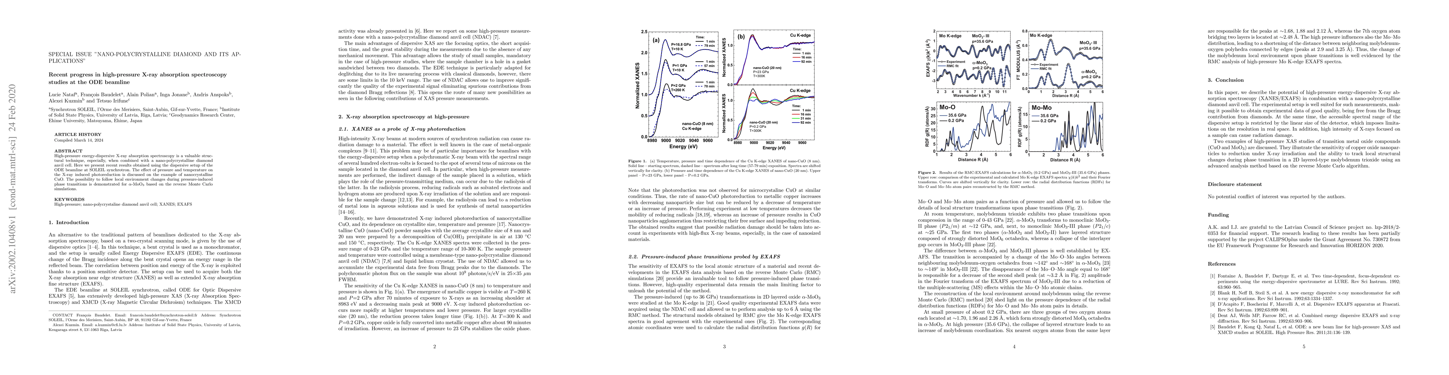 This paper discusses recent advancements in high-pressure X-ray absorption spectroscopy at the ODE beamline, revealing insights into pressure and temperature effects on X-ray induced photoreduction using nanocrystalline CuO and tracking local environment changes during phase transitions in alpha-MoO3 via reverse Monte Carlo simulations.