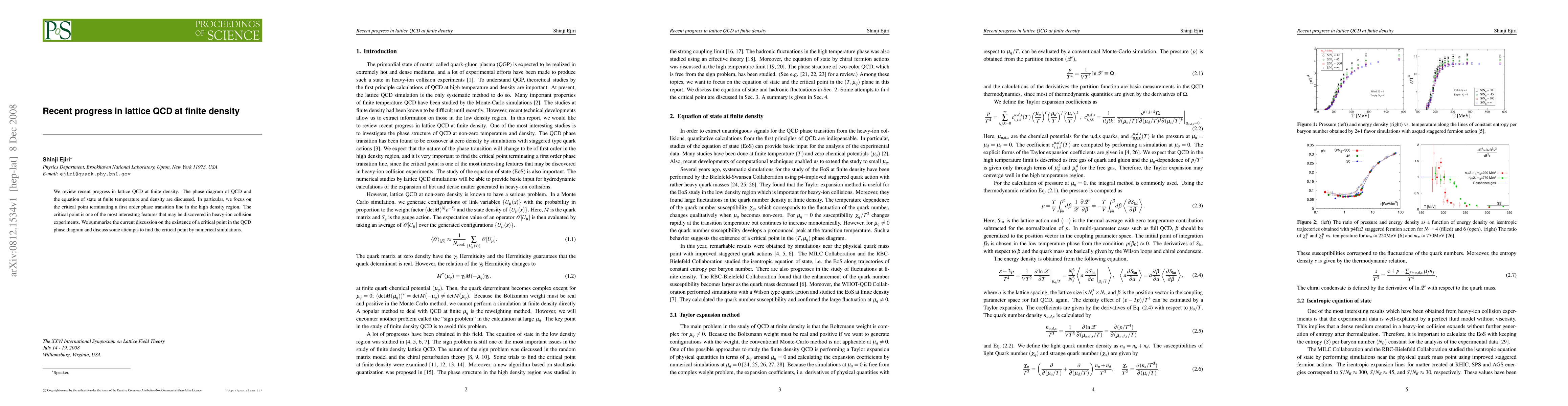 We review recent progress in lattice QCD at finite density. The phase diagram of QCD and the equation of state at finite temperature and density are discussed. In particular, we focus on the critical point terminating a first order phase transition line in the high density region. The critical point is one of the most interesting features that may be discovered in heavy-ion collision experiments. We summarize the current discussion on the existence of a critical point in the QCD phase diagram and discuss some attempts to find the critical point by numerical simulations.