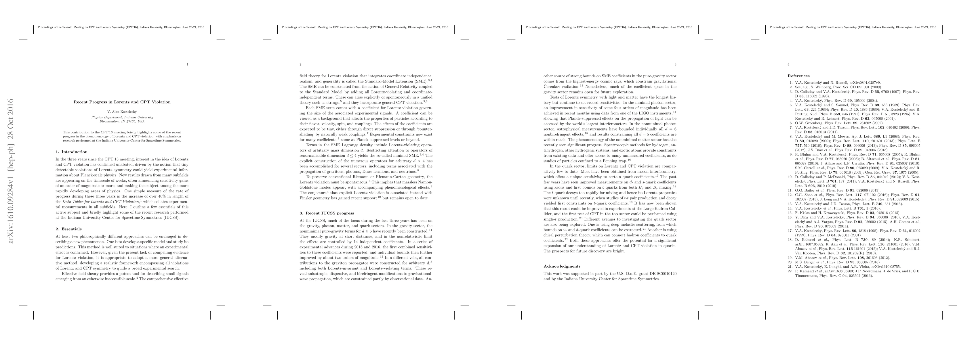This contribution to the CPT'16 meeting briefly highlights some of the recent progress in the phenomenology of Lorentz and CPT violation, with emphasis on research performed at the Indiana University Center for Spacetime Symmetries.