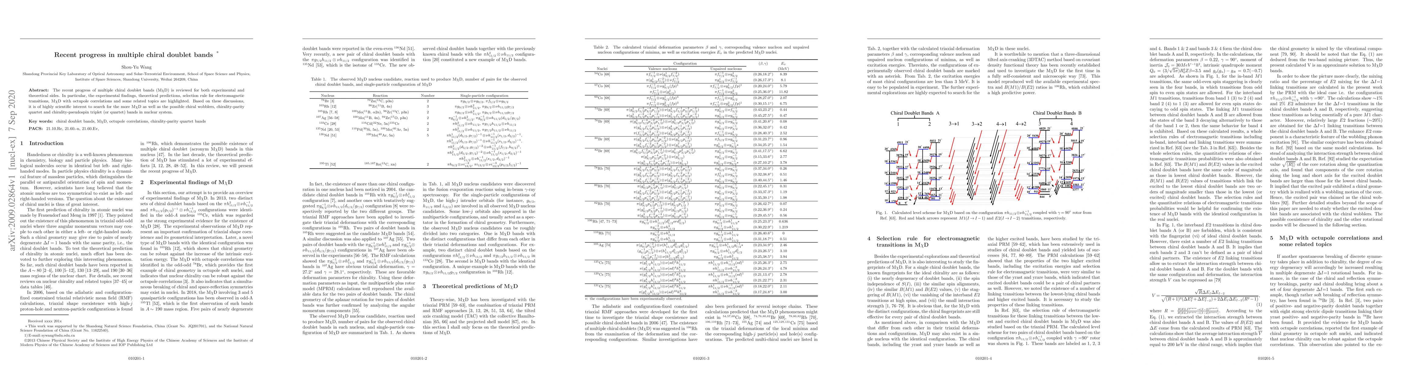 This paper reviews recent advancements in multiple chiral doublet bands, emphasizing both experimental findings and theoretical predictions, including electromagnetic transition rules and connections to octupole correlations. It highlights the scientific interest in discovering additional chiral bands and related structures in nuclear physics.